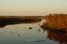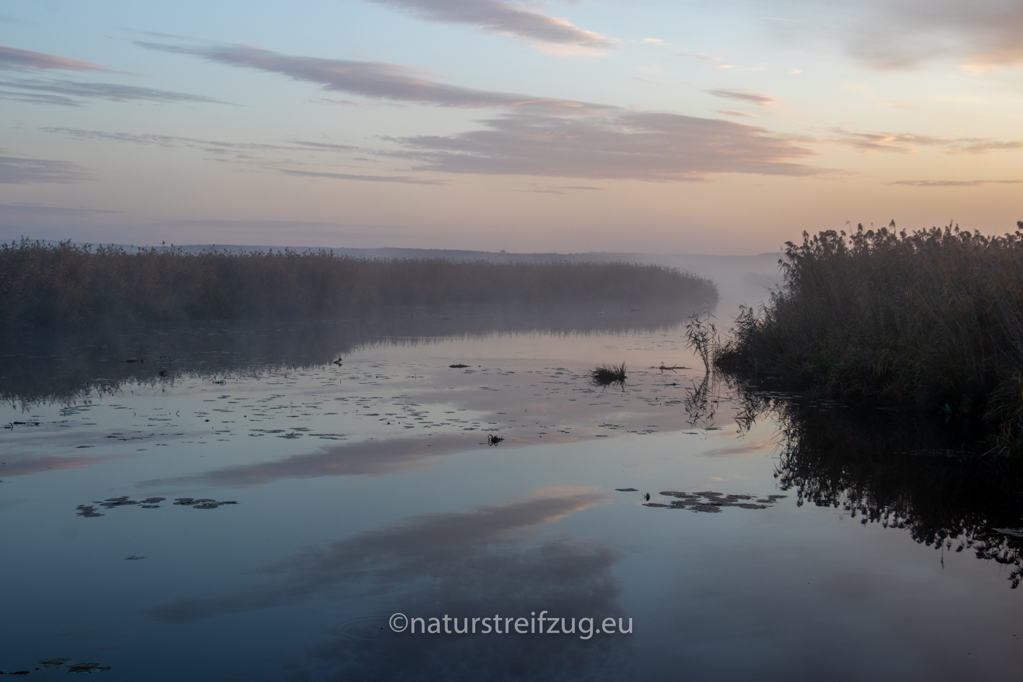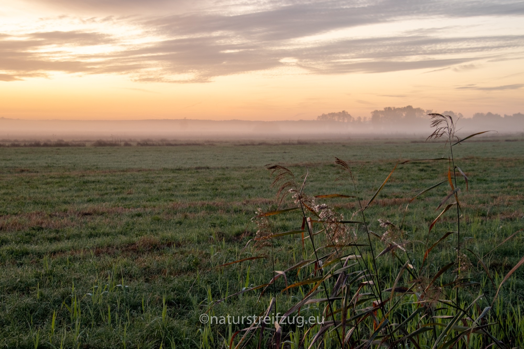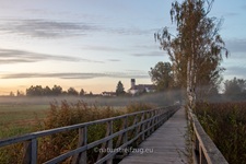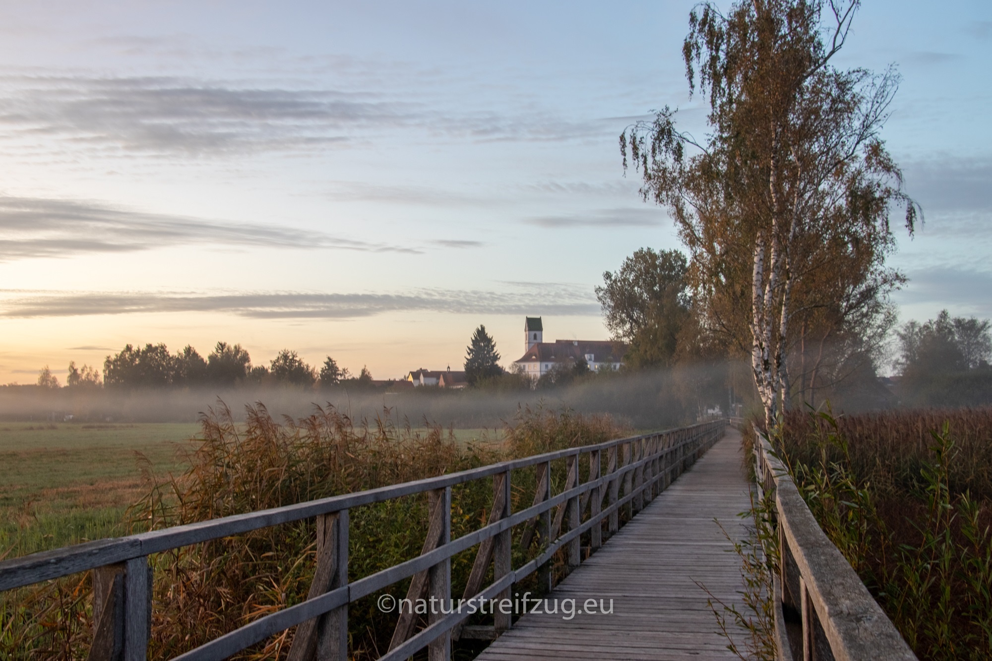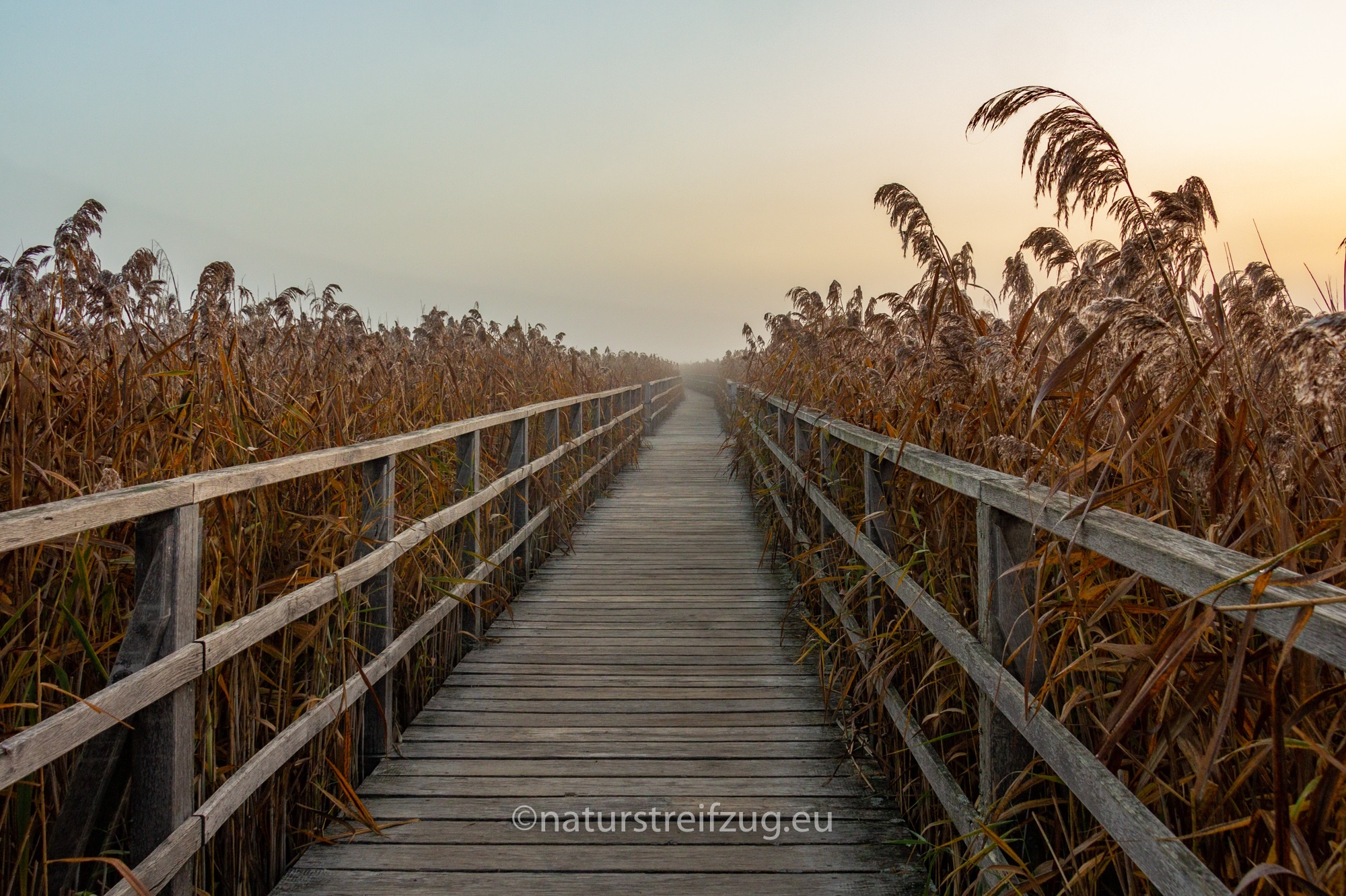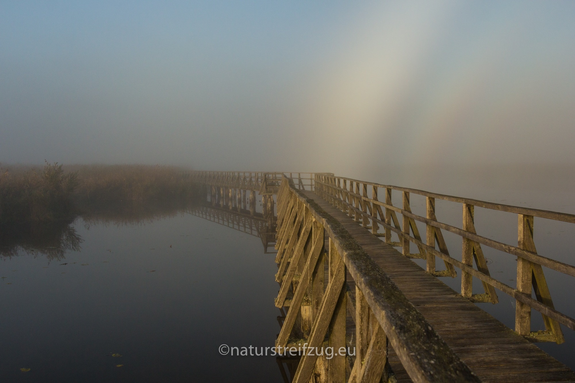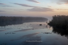 Am nächsten Morgen hieß es früh aufzustehen. Wir waren nicht die einzigen, die schon gegen sieben Uhr unterwegs waren, denn andere pilgerten auch schon schwer mit Kameras und Stativen behangen auf den Steg hinaus. Es war dämmrig, das erste Morgenrot zeigte sich. Herbstnebel lag über der Moorlandschaft. Deshalb machten wir erst Halt für Landschaftsfotos, auch wenn sich an der Stelle, an der sich später offenbar bevorzugt die Bartmeisen zeigten, die ersten Fotografen positionierten, um die besten Plätze für sich zu reservieren. Für sie war erst einmal nur Warten angesagt.
