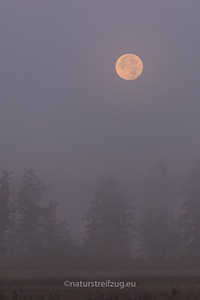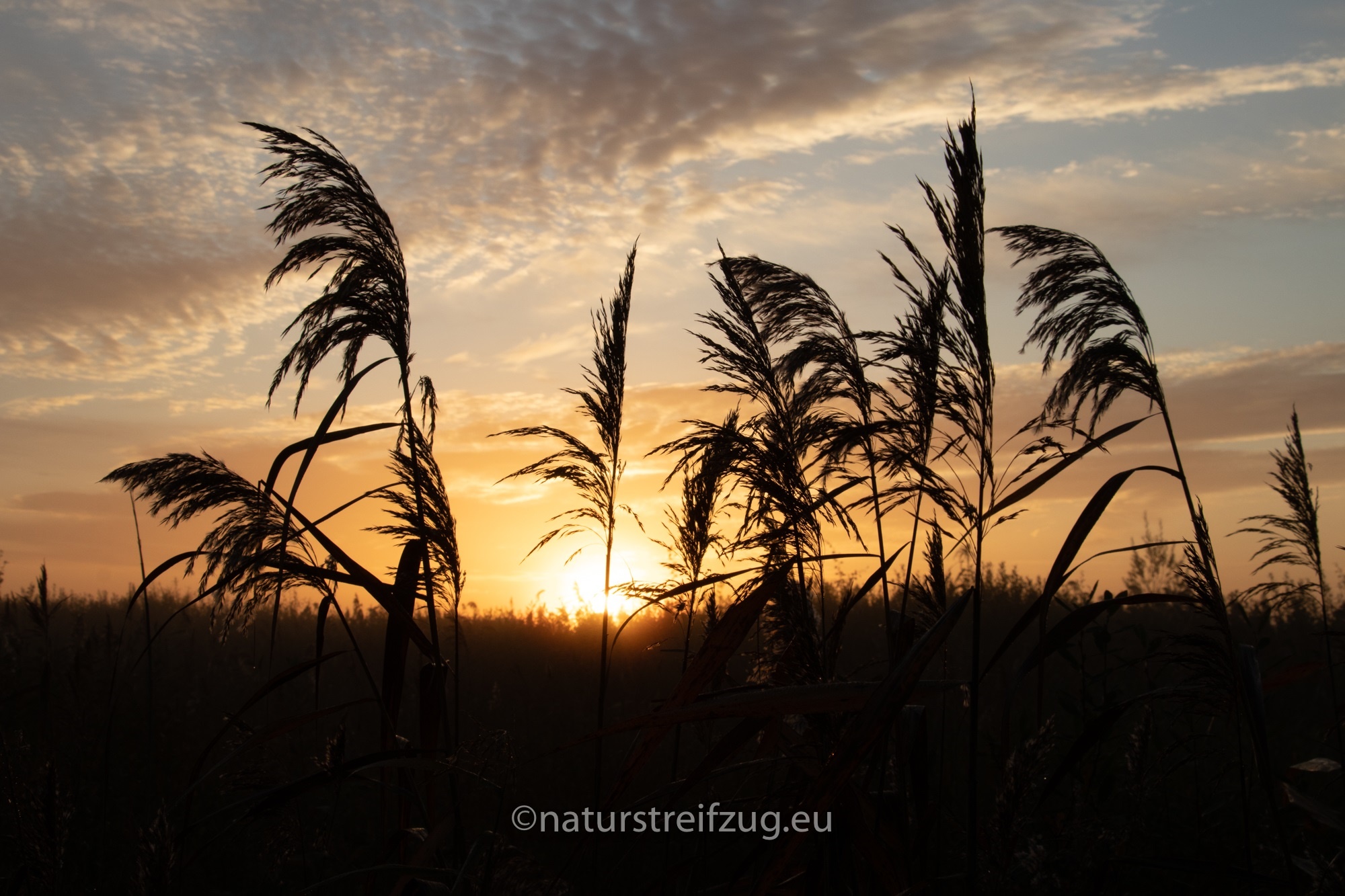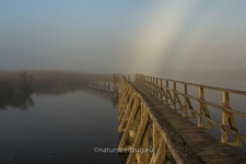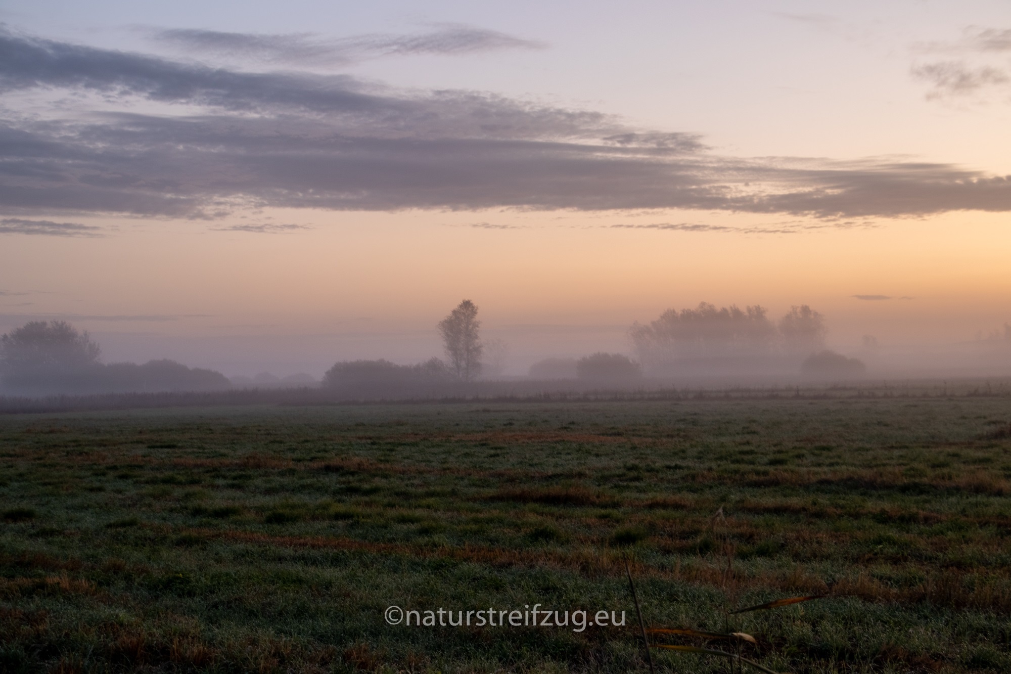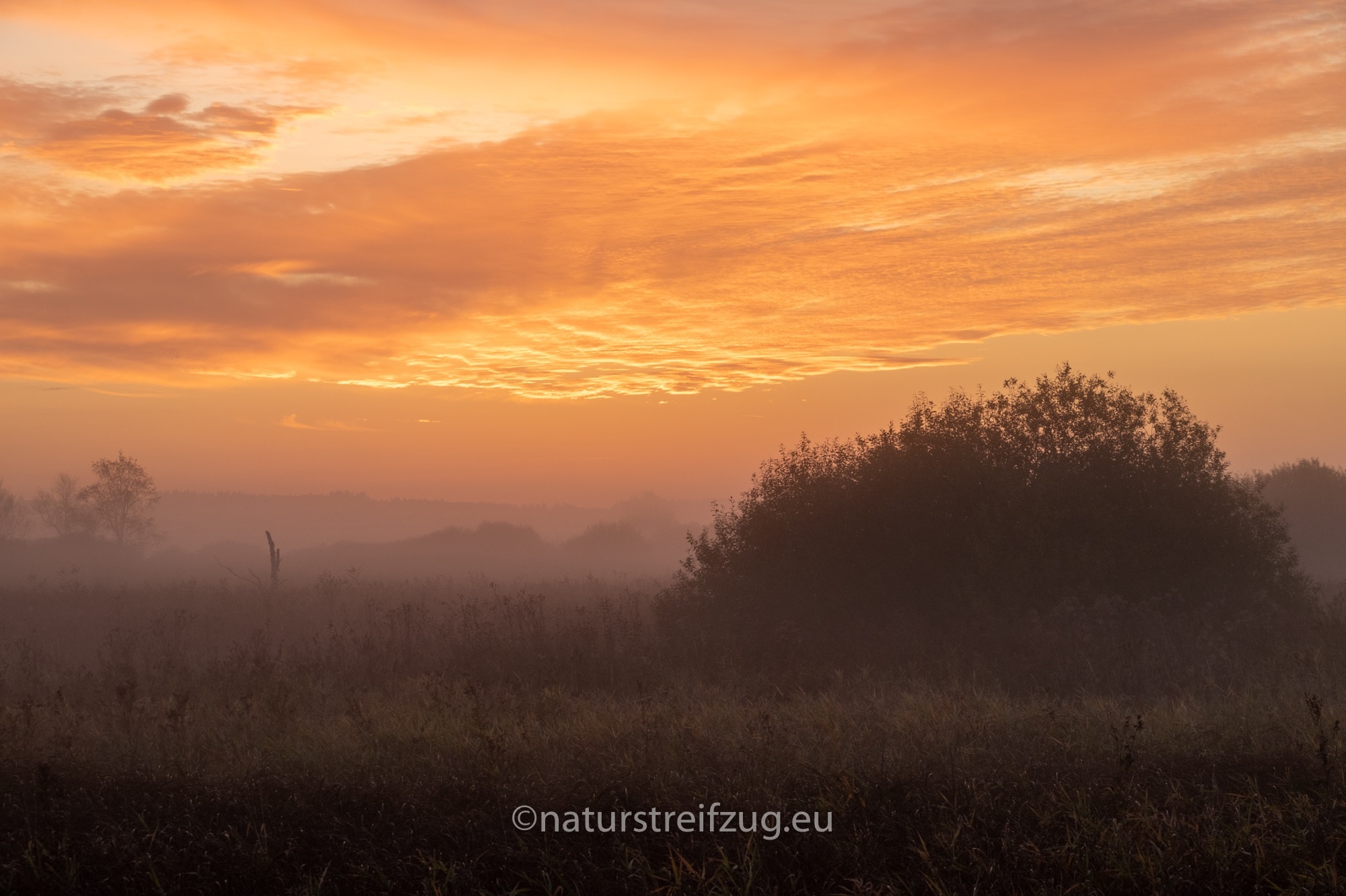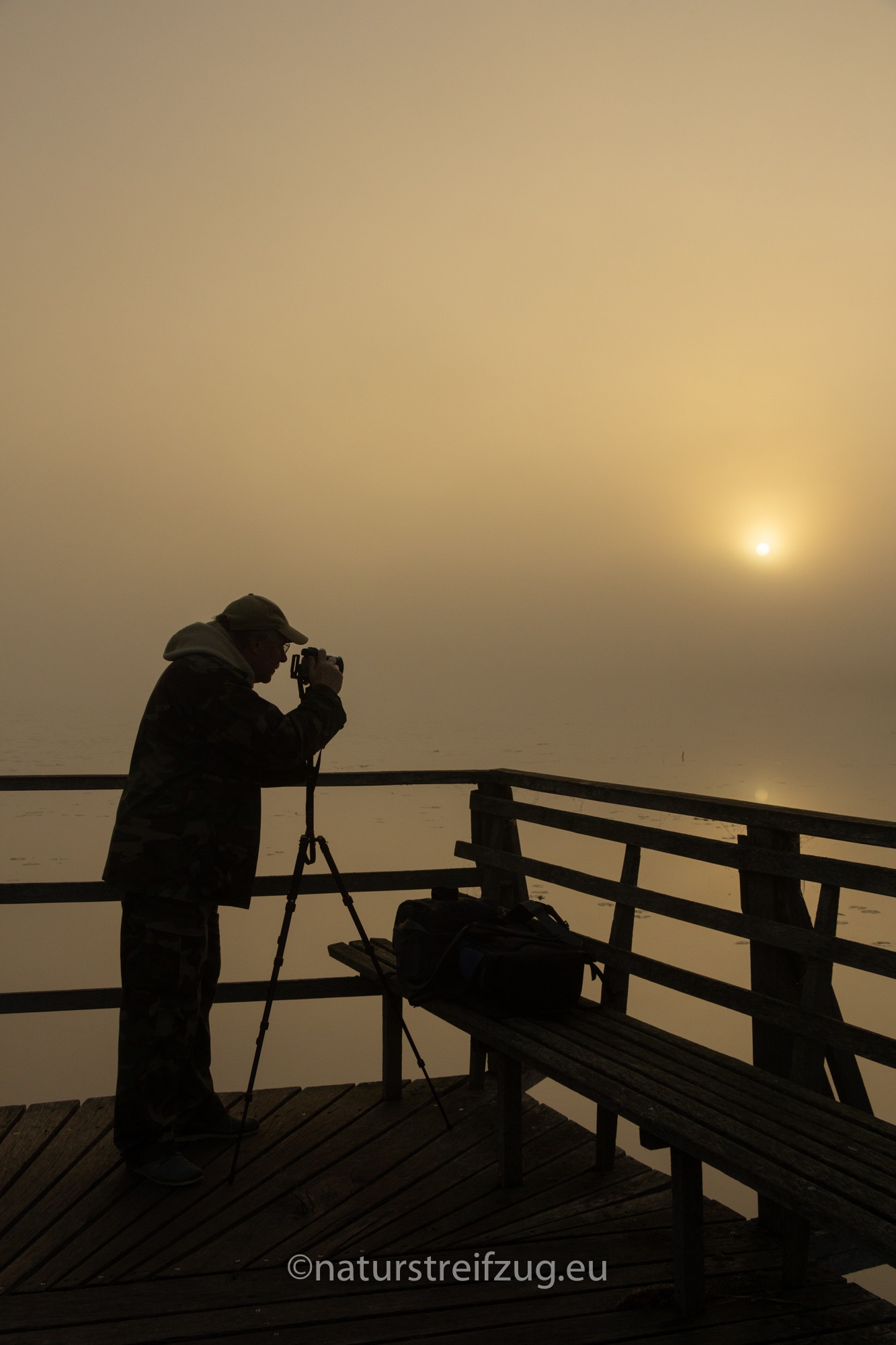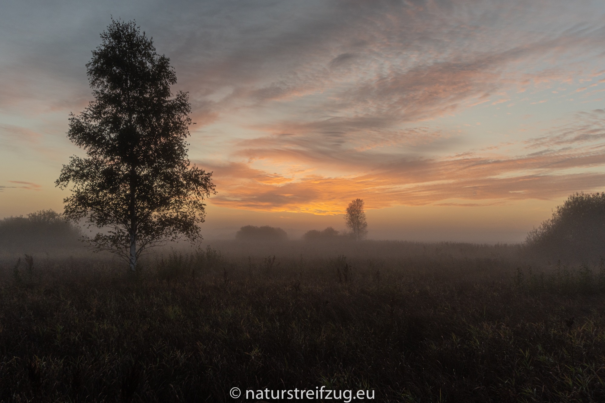 Am nächsten Morgen hieß es früh aufzustehen. Wir waren nicht die einzigen, die schon gegen sieben Uhr unterwegs waren, denn andere pilgerten auch schon schwer mit Kameras und Stativen behangen auf den Steg hinaus. Es war dämmrig, das erste Morgenrot zeigte sich. Herbstnebel lag über der Moorlandschaft. Deshalb machten wir erst Halt für Landschaftsfotos, auch wenn sich an der Stelle, an der sich später offenbar bevorzugt die Bartmeisen zeigten, die ersten Fotografen positionierten, um die besten Plätze für sich zu reservieren. Für sie war erst einmal nur Warten angesagt.