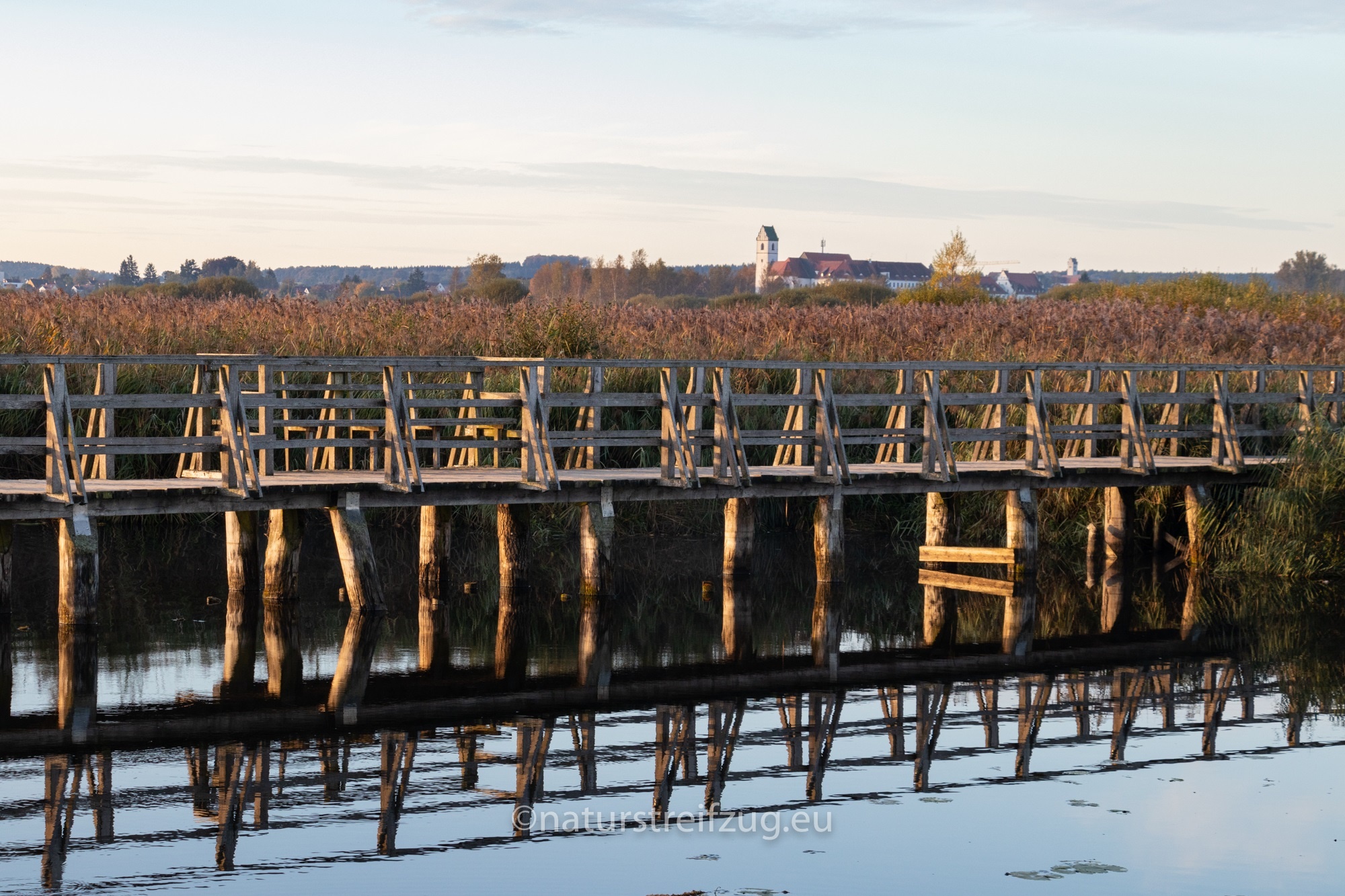 Ein sehr warmes Herbst-Wochenende im Oktober 2019 war angekündigt. Die letzte Gelegenheit des Jahres, um an den Federsee zu fahren und Bartmeisen zu fotografieren, die es dort in nennenswerter Anzahl noch gibt. Ein Stellplatz in Bad Buchau war trotz des lebhaften Wochenendbetriebes aufgrund von zwei großen Kurkliniken zum Glück schnell gefunden. Der Federsee ist umgeben von Moorlandschaft, die dem Naturschutz unterliegt. Deshalb ist die Region nur auf einem 1,3 km langen Steg zu betreten.