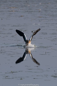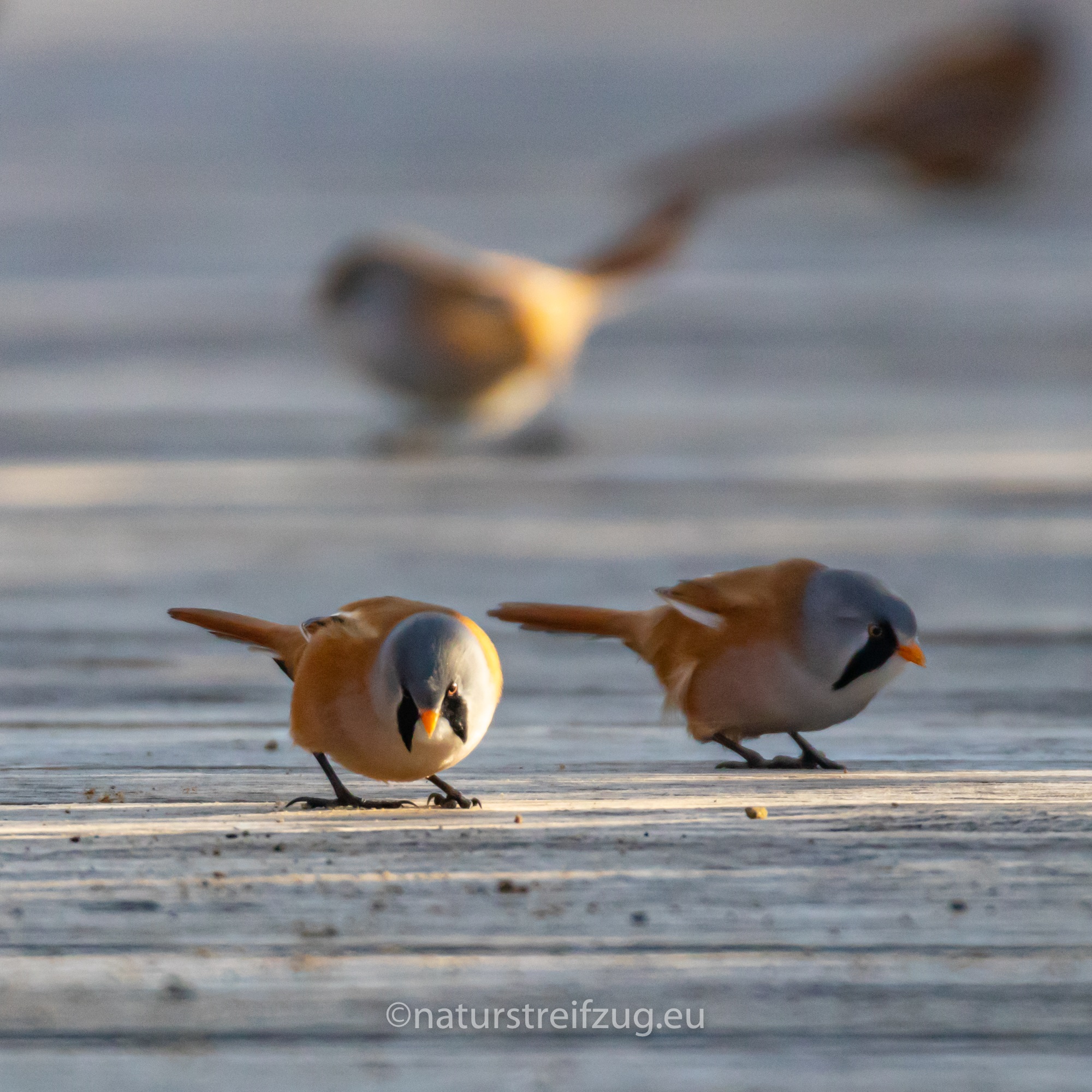 Erst tat sich nichts. Wir hörten die Bartmeisen, aber wir konnten sie im Schilfdickicht, das den Steg säumt, nicht erkennen. Ab und zu flog ein Trupp über uns hinweg. An zwei Stellen führen schmale Gassen im Schilf zu Fischerhütten. Auf den Bohlen war Sand ausgelegt worden. Wir erfuhren, dass im Herbst die Bartmeisen ihre Ernährung von Weichfutter auf Körnerfutter umstellen. Um die Körner verdauen zu können, müssen sie Sand aufnehmen, der die Körner im Magen durch Reibung aufschließt.