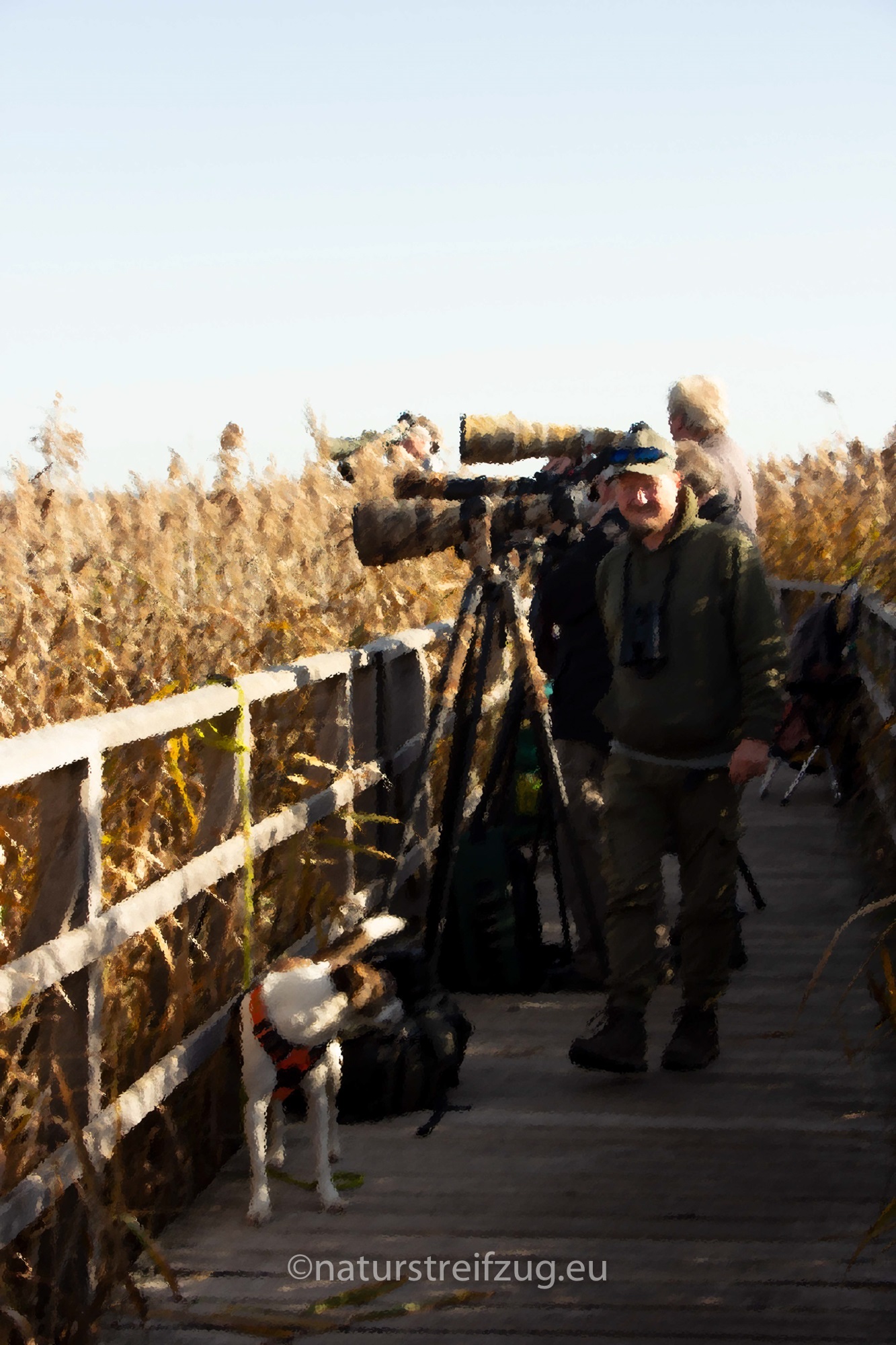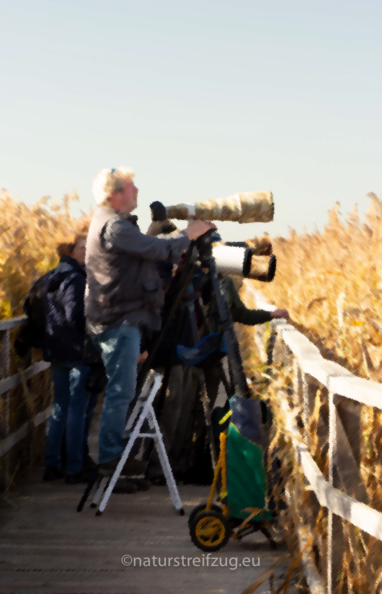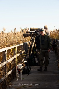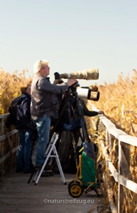 An den Schilfgassen war die Chance am größten, ein Bild von einer Bartmeise oben auf einem Binsenwedel zu ergattern. Darauf warteten die Profis - mit allen möglichen Tricks: natürlich mit den längsten Rohren, die der Markt hergibt, aber auch mit Trittleitern, mit dicken Stativen bestückte Sitzbänke, Schraubzwingen und Brettern für an Geländer gebastelte Plattformen .....
