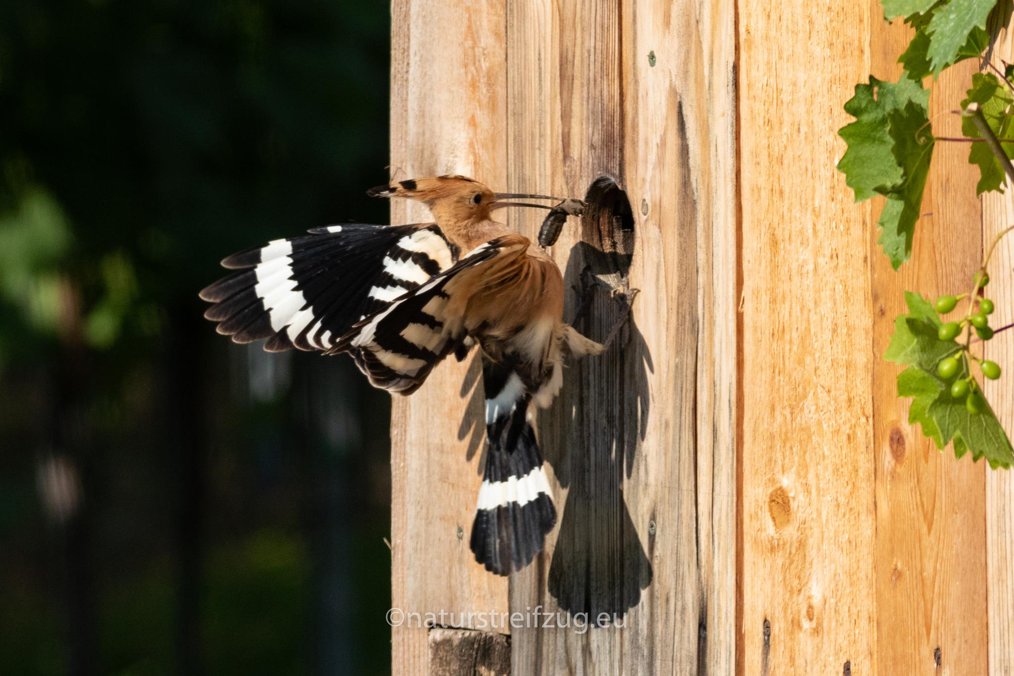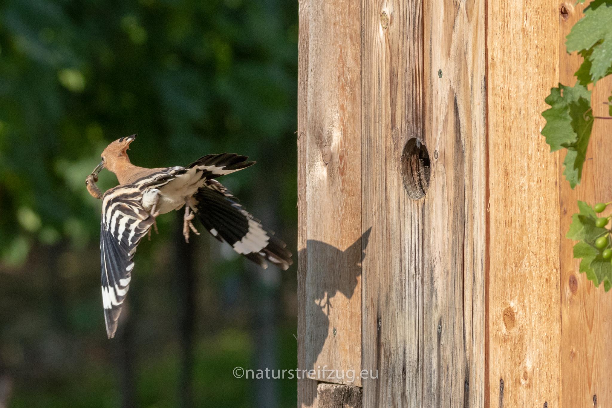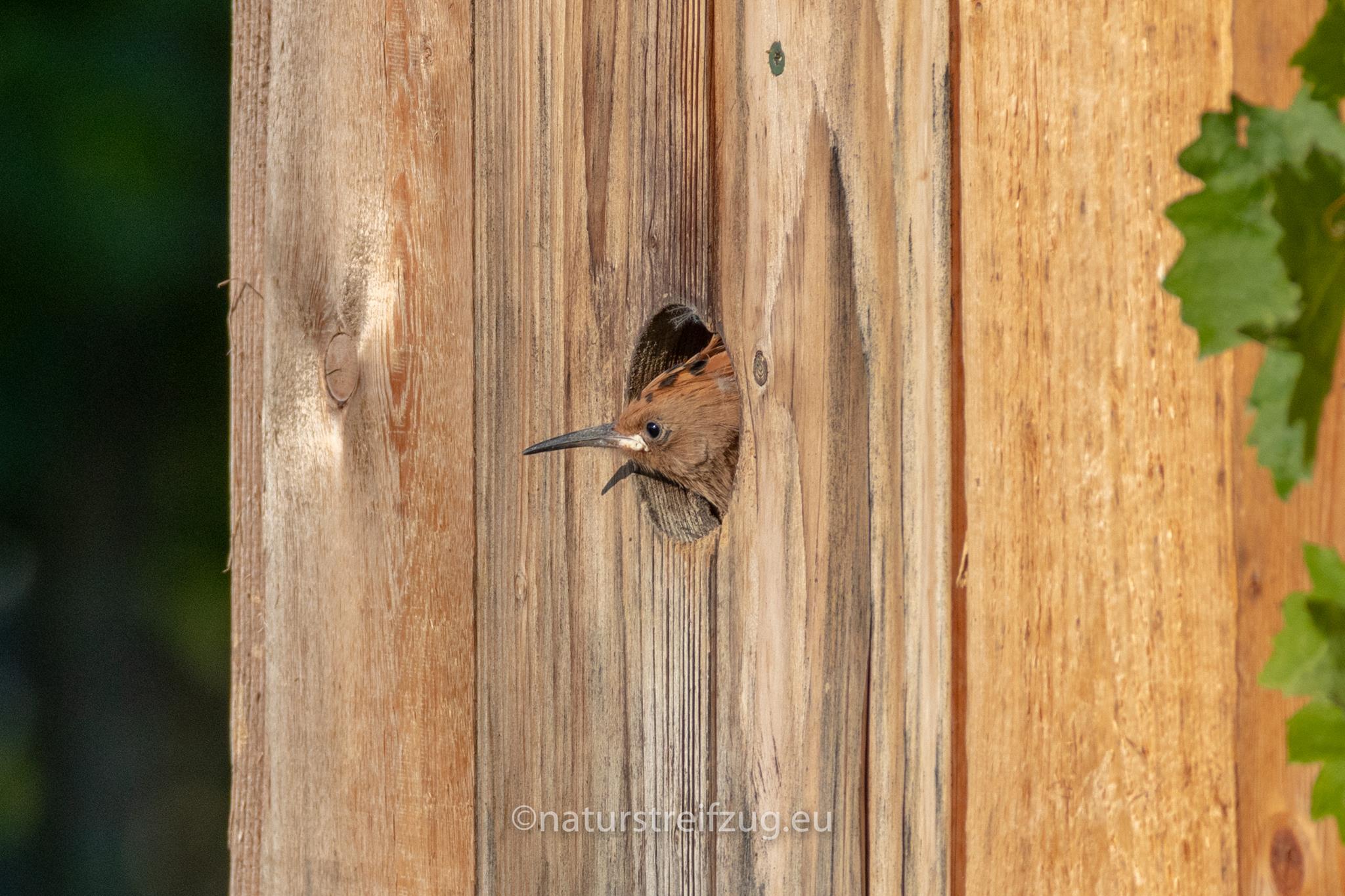 Also hieß es von April bis Juni 2018, nachdem das Wetter endlich besser wurde, mit Fernglas herumlaufen und die Gegend unter die Lupe zu nehmen. Schon bald hörten wir huphuphup und sichteten einen Wiedehopf, der sich in der Nähe einer versteckten Rebhütte herumtrieb, die bei näherer Inspizierung auch ein passendes Loch aufwies. Dort saß ein zweiter Vogel. Offenbar hatten wir Glück....