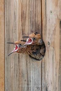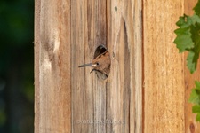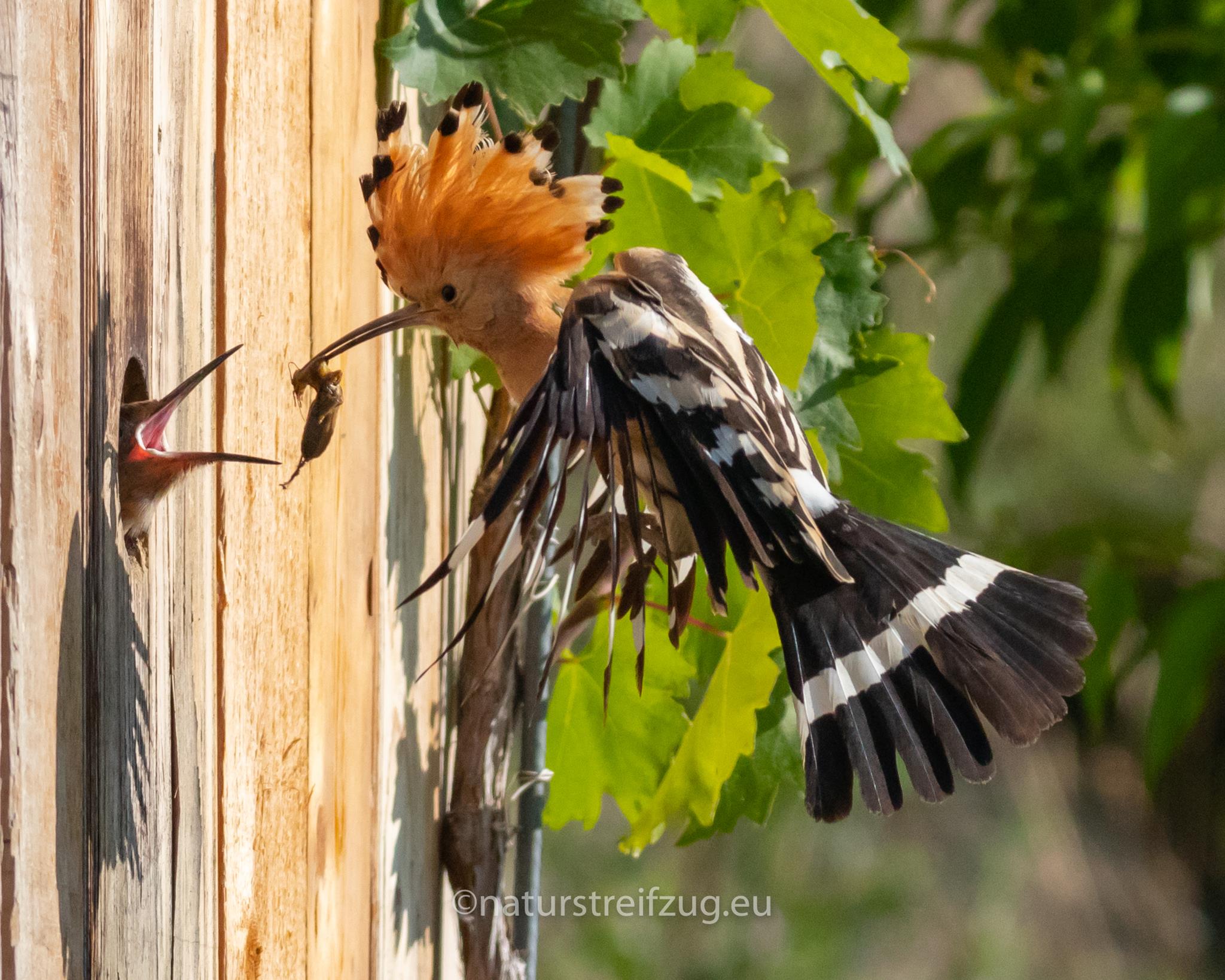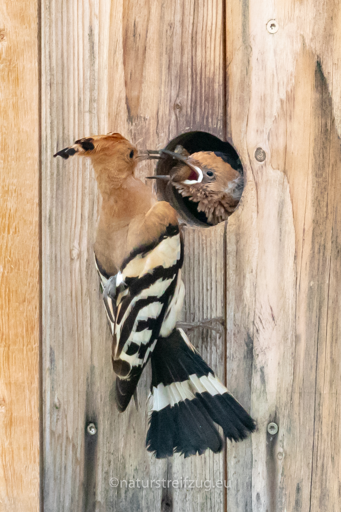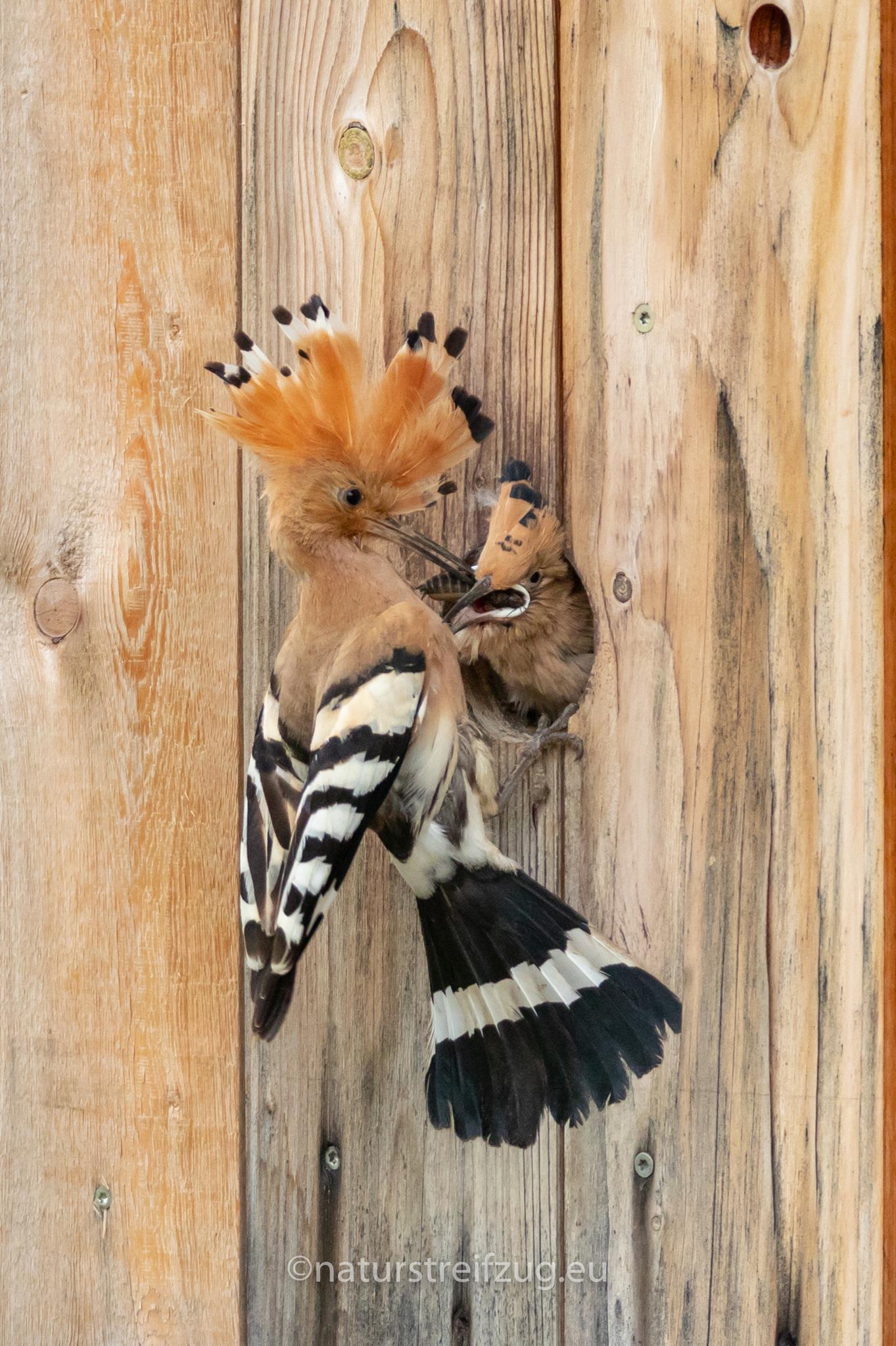 Kamen die Jungen ins ausflugsfähige Alter aus Hotel Mama, wurden die Abstände zwischen den Fütterungen größer, wohl um die Jungen aus dem Nest zu locken. So beobachteten wir, wie sich der Altvogel mit Beute dem Loch näherte, den Kopf hineinsteckte, einem der letzten verbliebenen der 7 Jungtiere die Beute vorhielt, den Kopf wieder zurückzog und wegflog.
