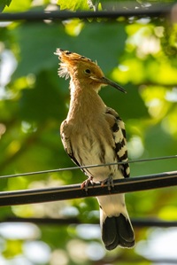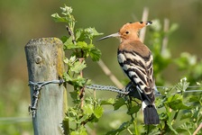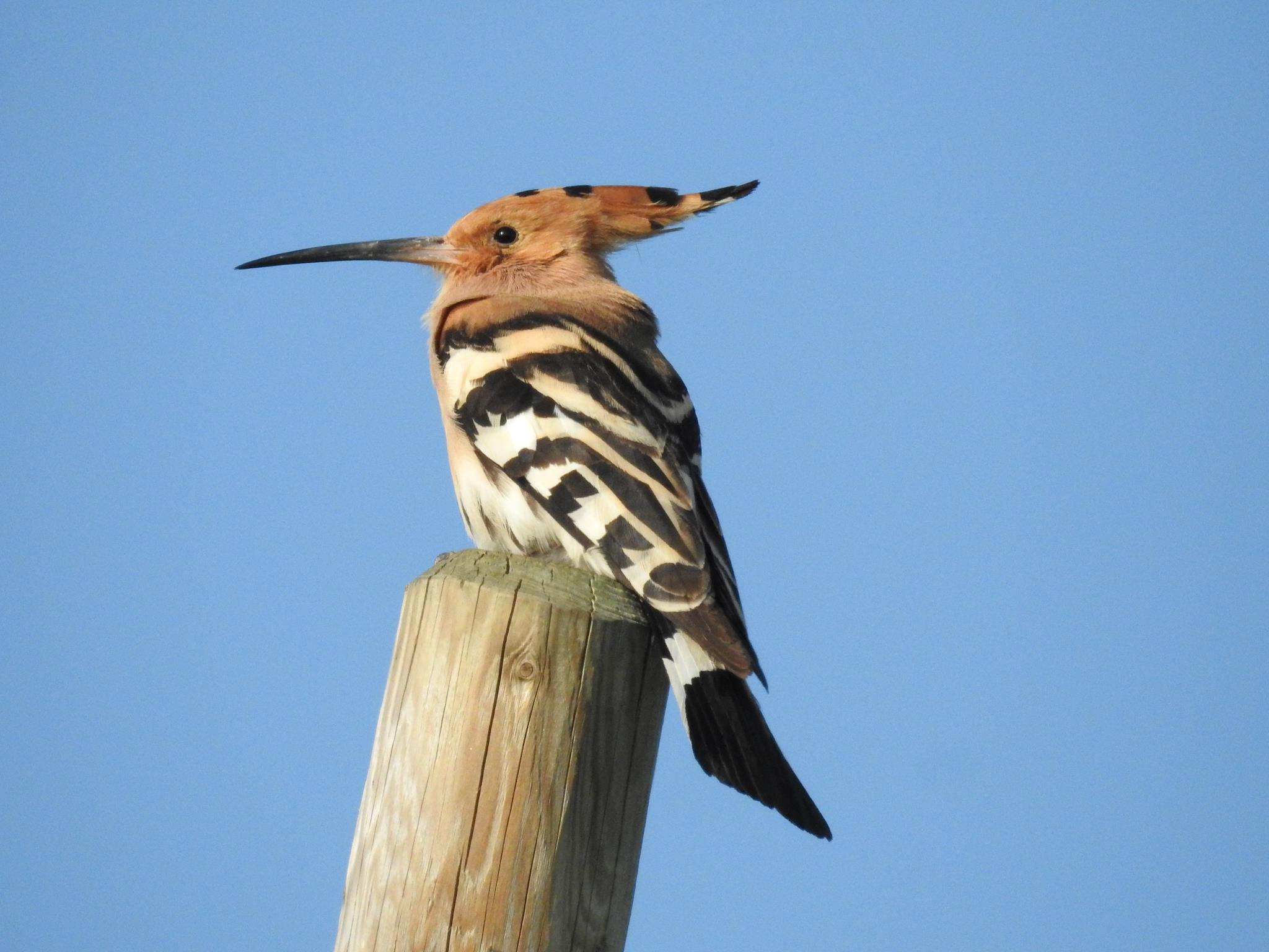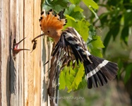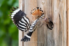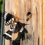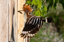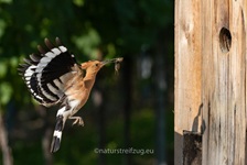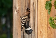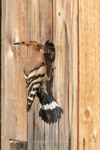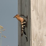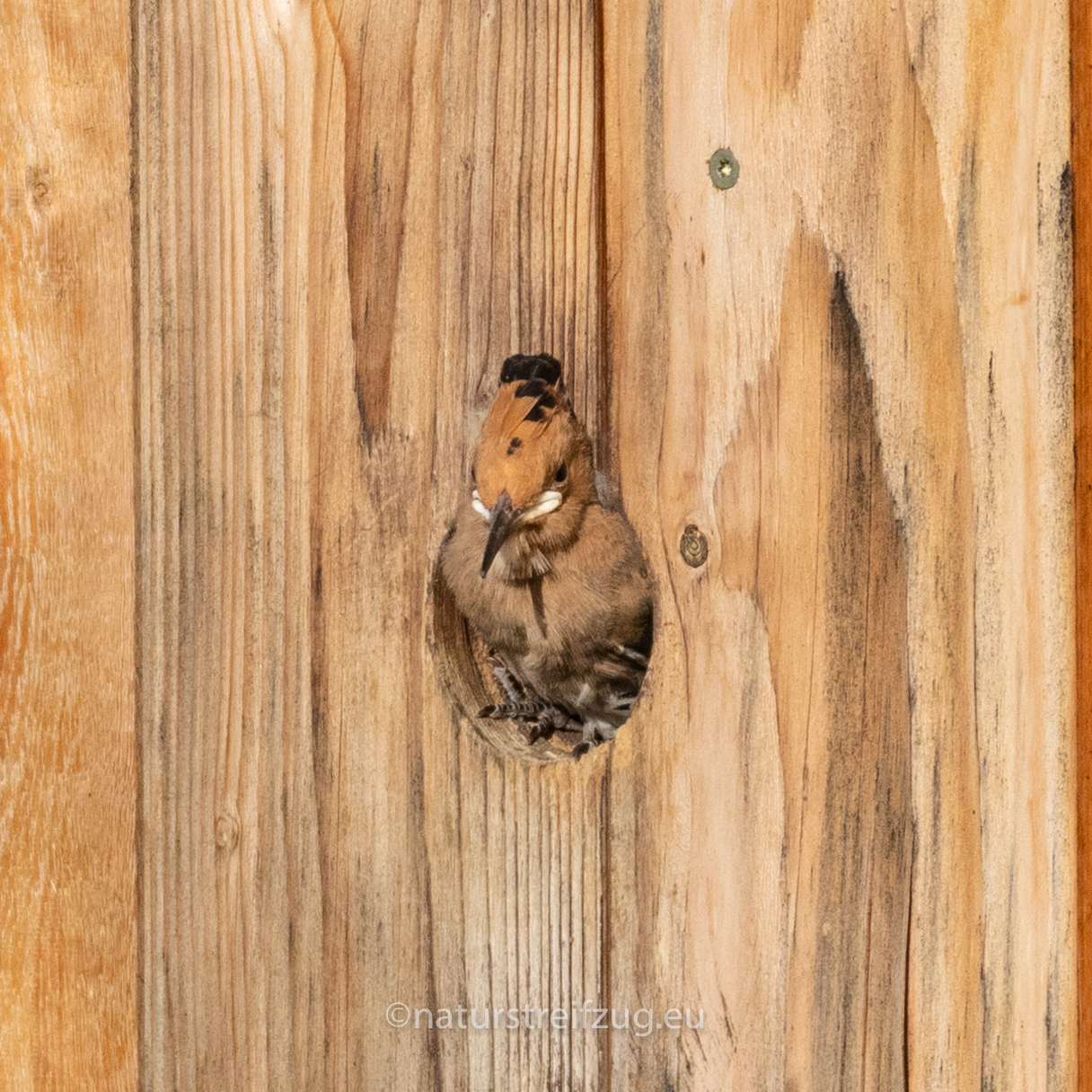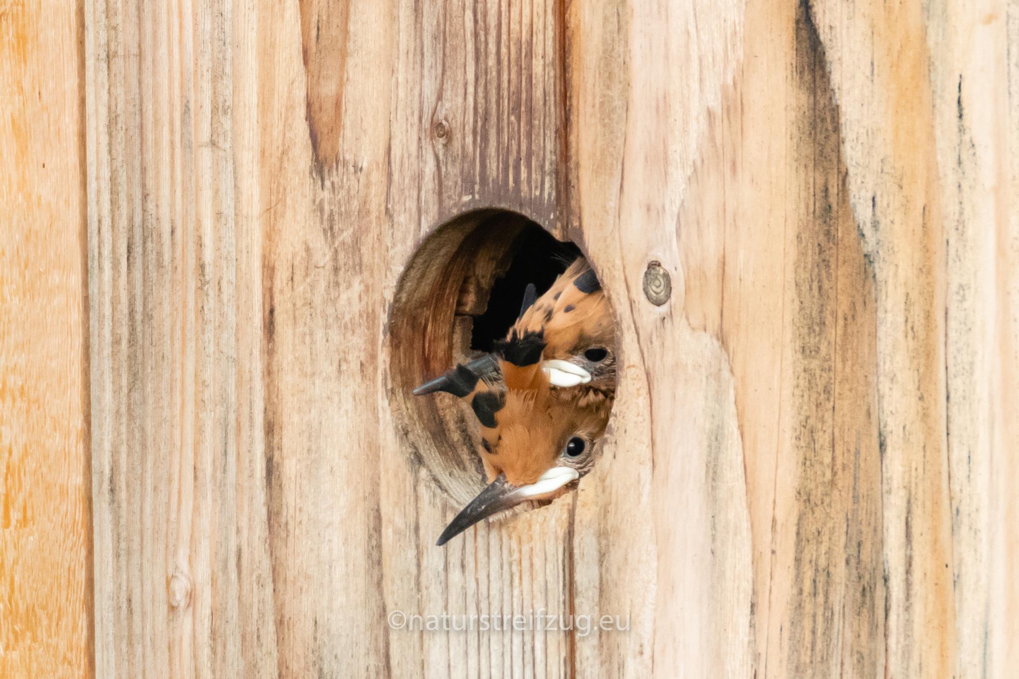 Bei einem Besuch ein paar Tage später im Mai mussten wir jedoch feststellen, dass sich an der Hütte nichts mehr tat. Es sah so aus, als hätte das Wiedehopf-Weibchen die angebotene Unterkunft nicht angenommen. Das bedeutete für uns, wieder mit Fernglas und viel Geduld auf die Suche zu gehen und die Gegend zu beobachten. Schon bald danach wurden wir wieder fündig. Ein Wiedehopf saß in der Nähe einer zweiten Hütte und beim ersten Ansitz beobachteten wir Nestbauaktivitäten.