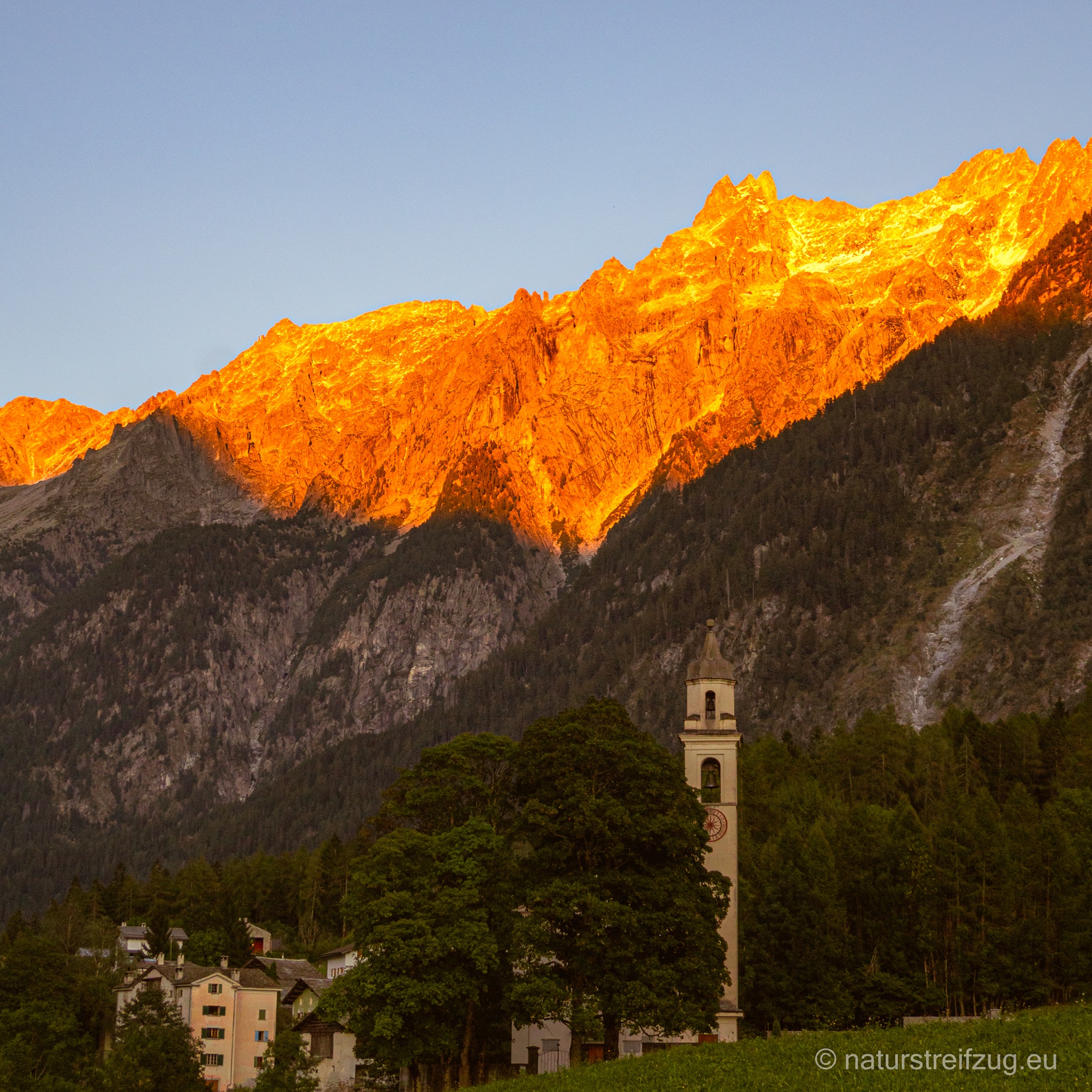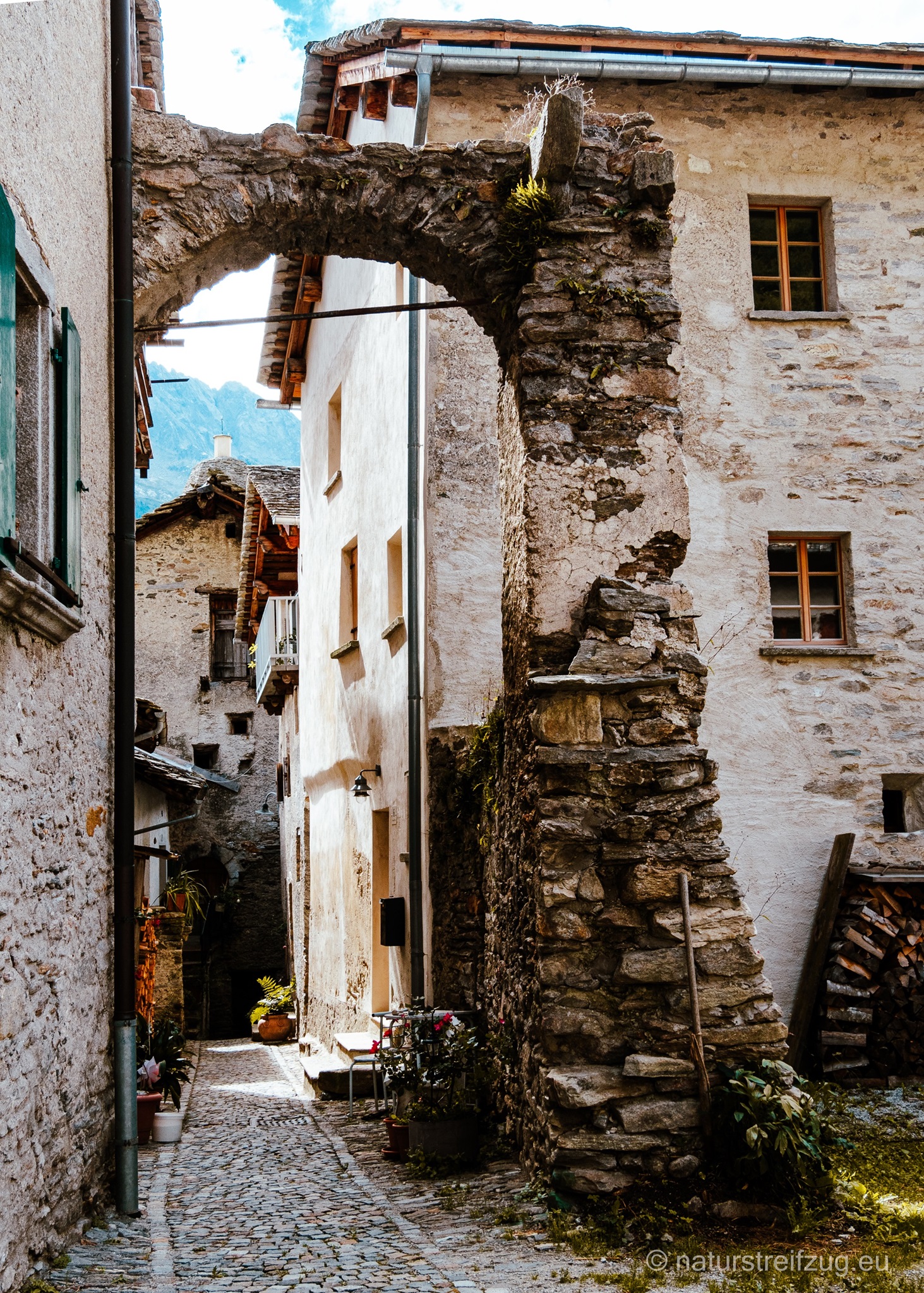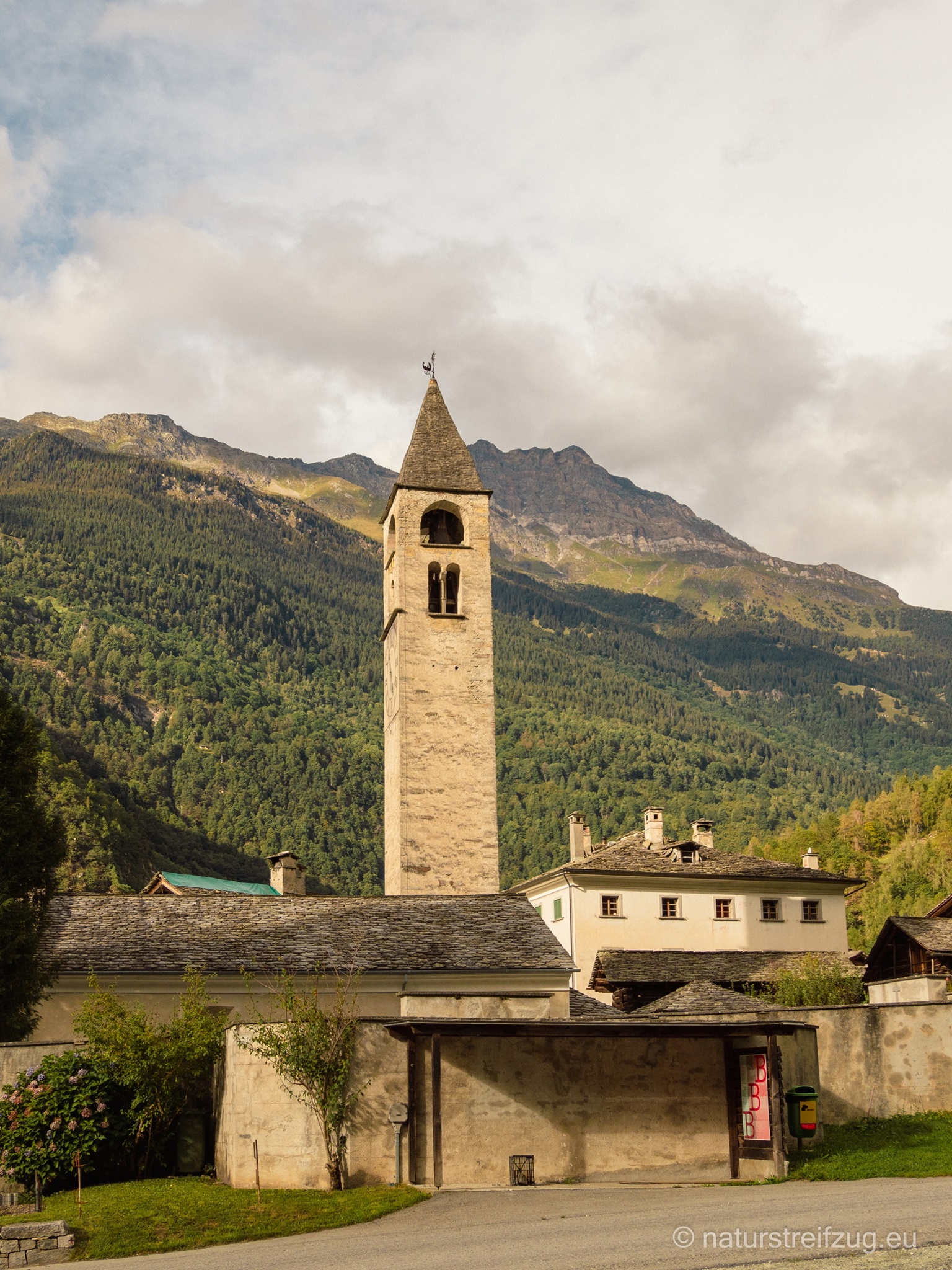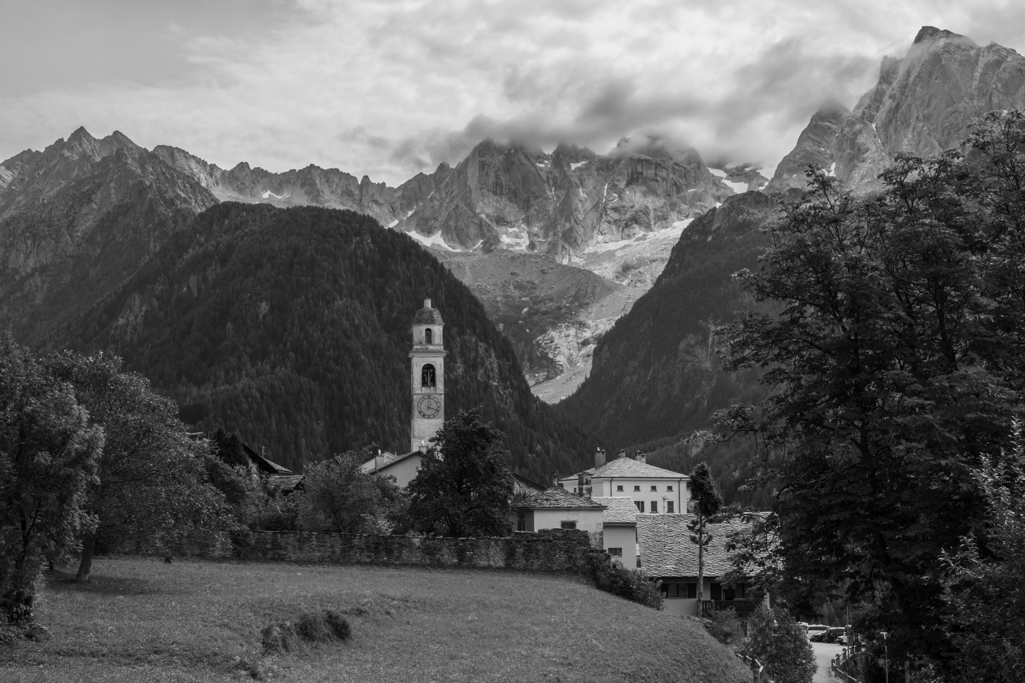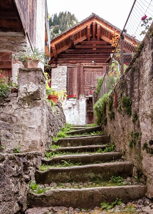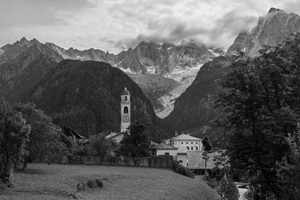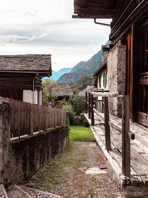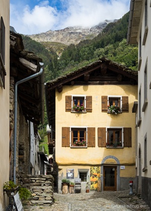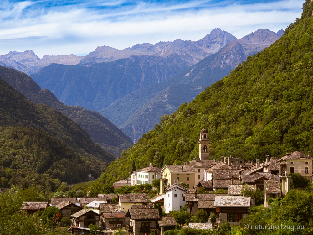 Soglio liegt auf 1090 m Höhe und zeichnet sich durch spektakuläre Aussichten aus. Nach Südosten schaut man direkt ins Bondascatal, auf den Piz Cengalo (3369m) und den Piz Badile (3305m). Nach Westen sieht man ins Tal Chiavenna. An den Häusern findet man Fotos, die erahnen lassen, wie das Leben zu früheren Zeiten aussah.