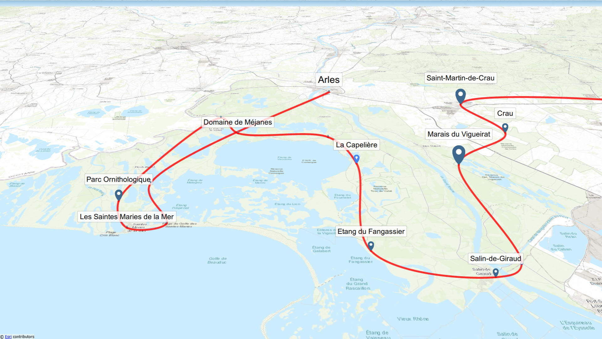Unsere Tour führte von Saint-Martin-de-Crau als erste Station weiter zu den Naturschutzgebieten Marais du Vigueirat, La Crau, La Capeliére und L'étang de Fangassier. Über Saline-de-Giraud ging es mit der Fähre über die Rhone weiter nach Saintes-Maries-de-la-Mer und zum Abschluss vor der Heimreise nach Arles.