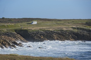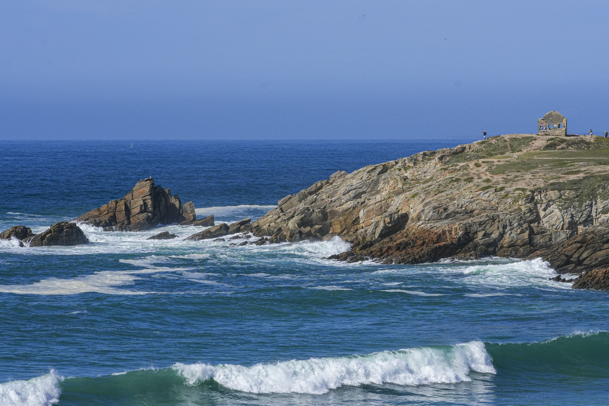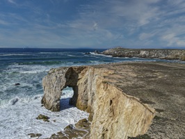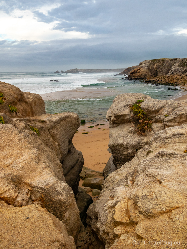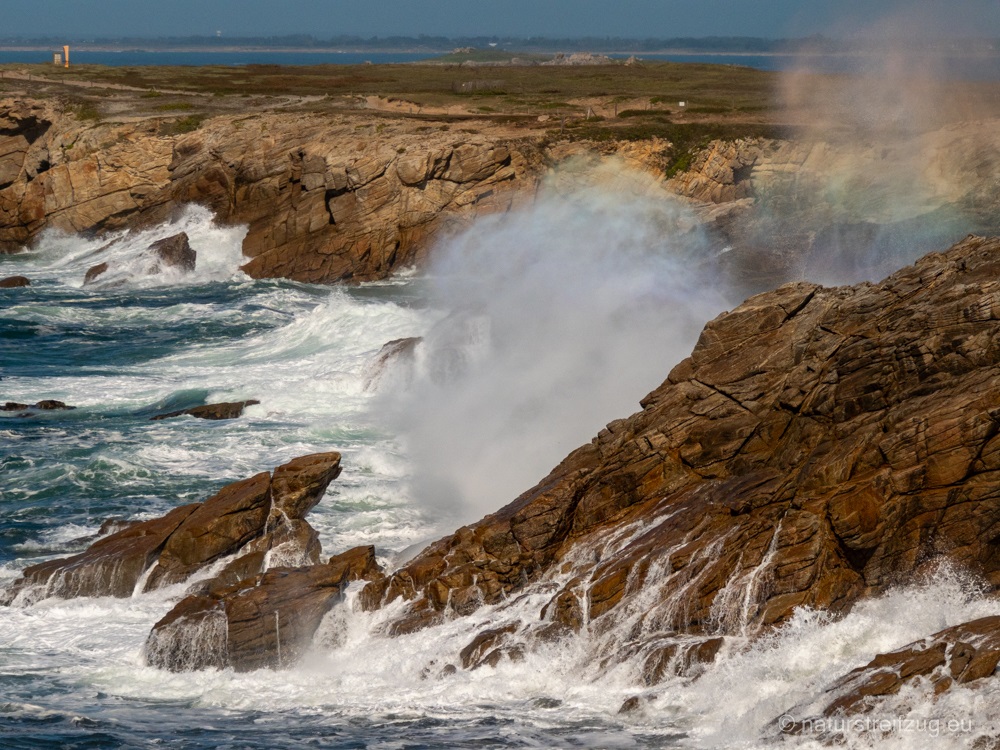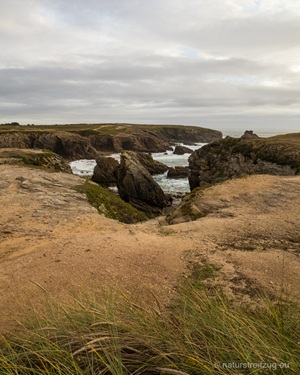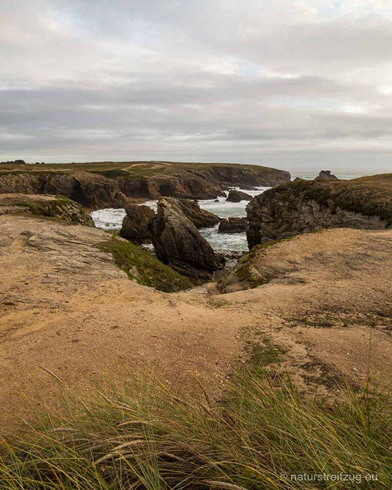 Quiberon ist über eine schmale Landbrücke aus Richtung Carnac zu erreichen. Auf der Ostseite gibt es Sandstrände, auf der anderen Seite steile Klippen. Wir parkten auf einem Wohnmobil-Parkplatz und liefen vor zur Küste. Gleich bot sich ein wunderschöner Ausblick auf ein Felsentor bei blauem Meer und Himmel. Das Meer brandete an die Küste. Eine Straße führt entlang der Küste. Überall gibt es Möglichkeiten zum Anhalten. Eine raue Bucht schöner als die andere - mit anderen Worten: Fotomotive ohne Ende.