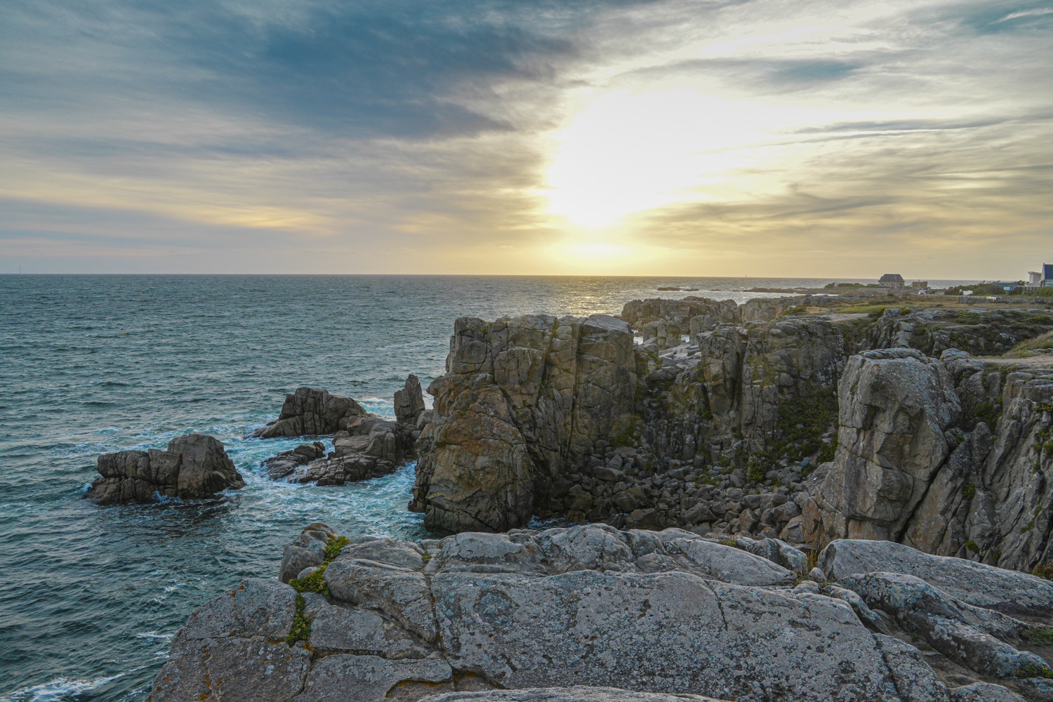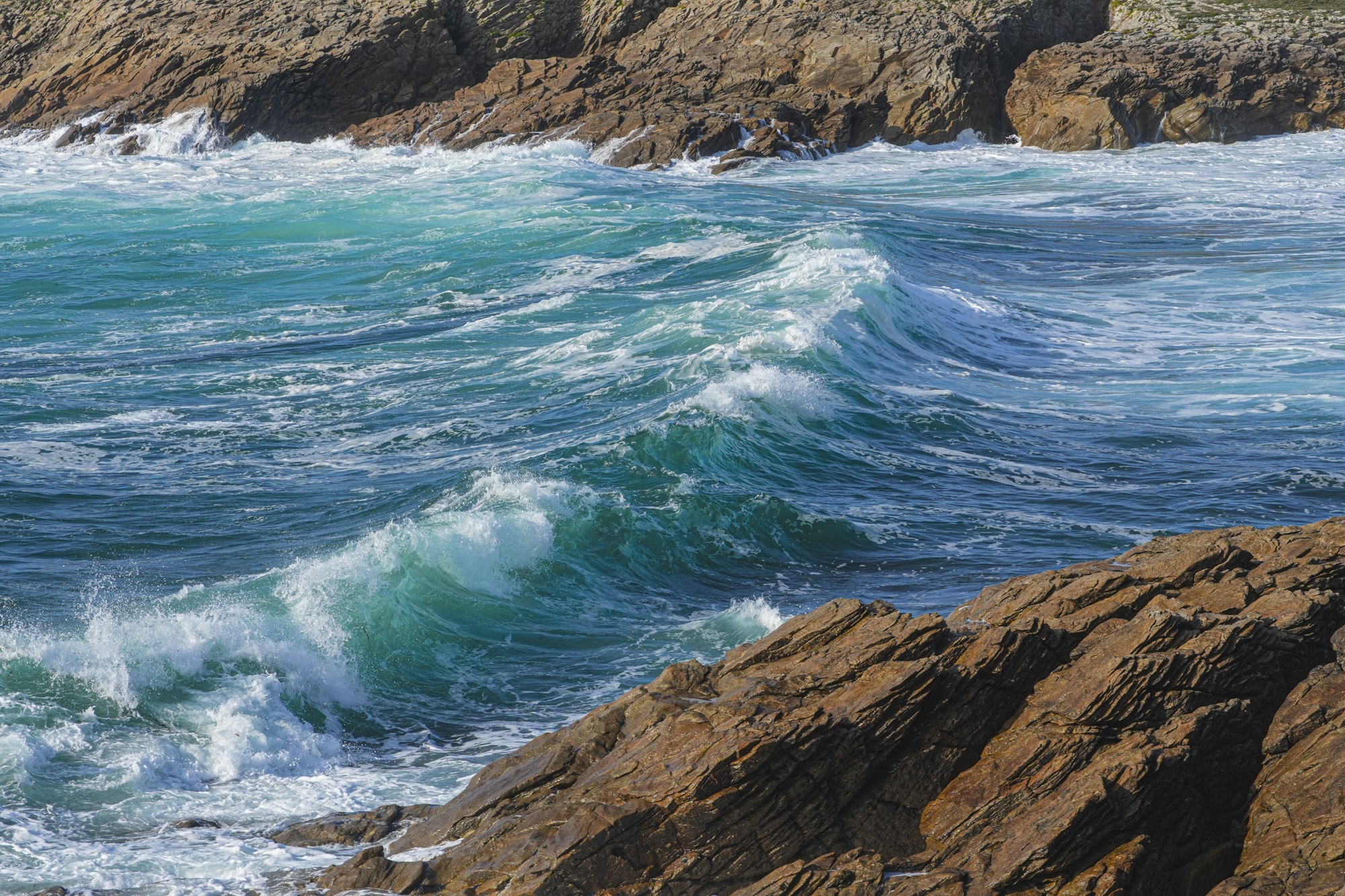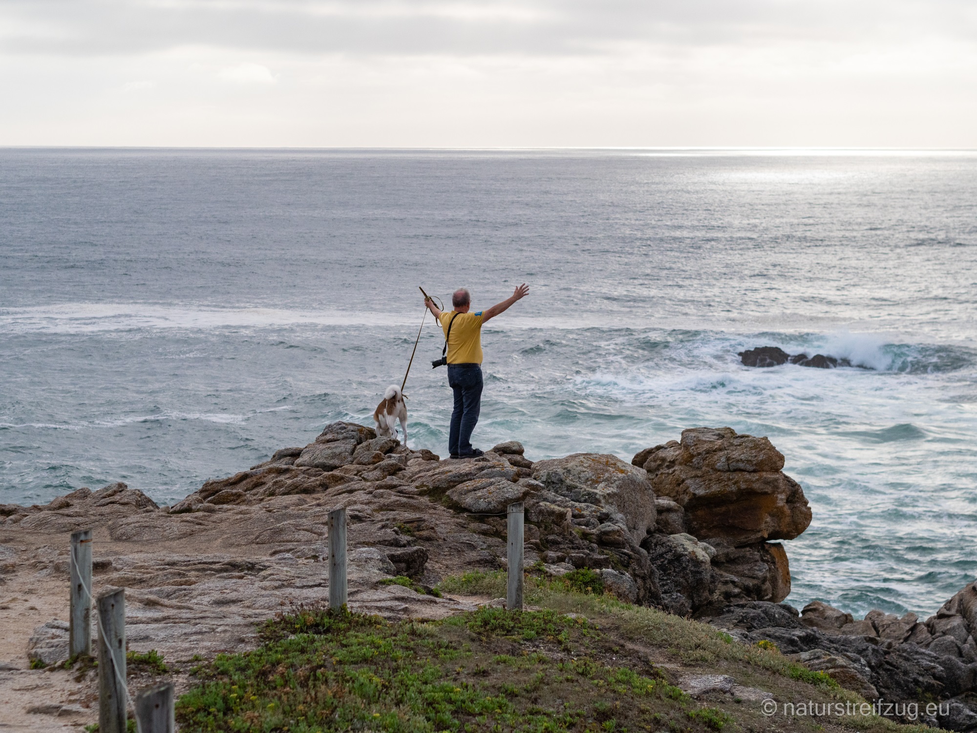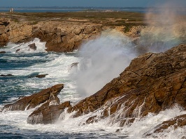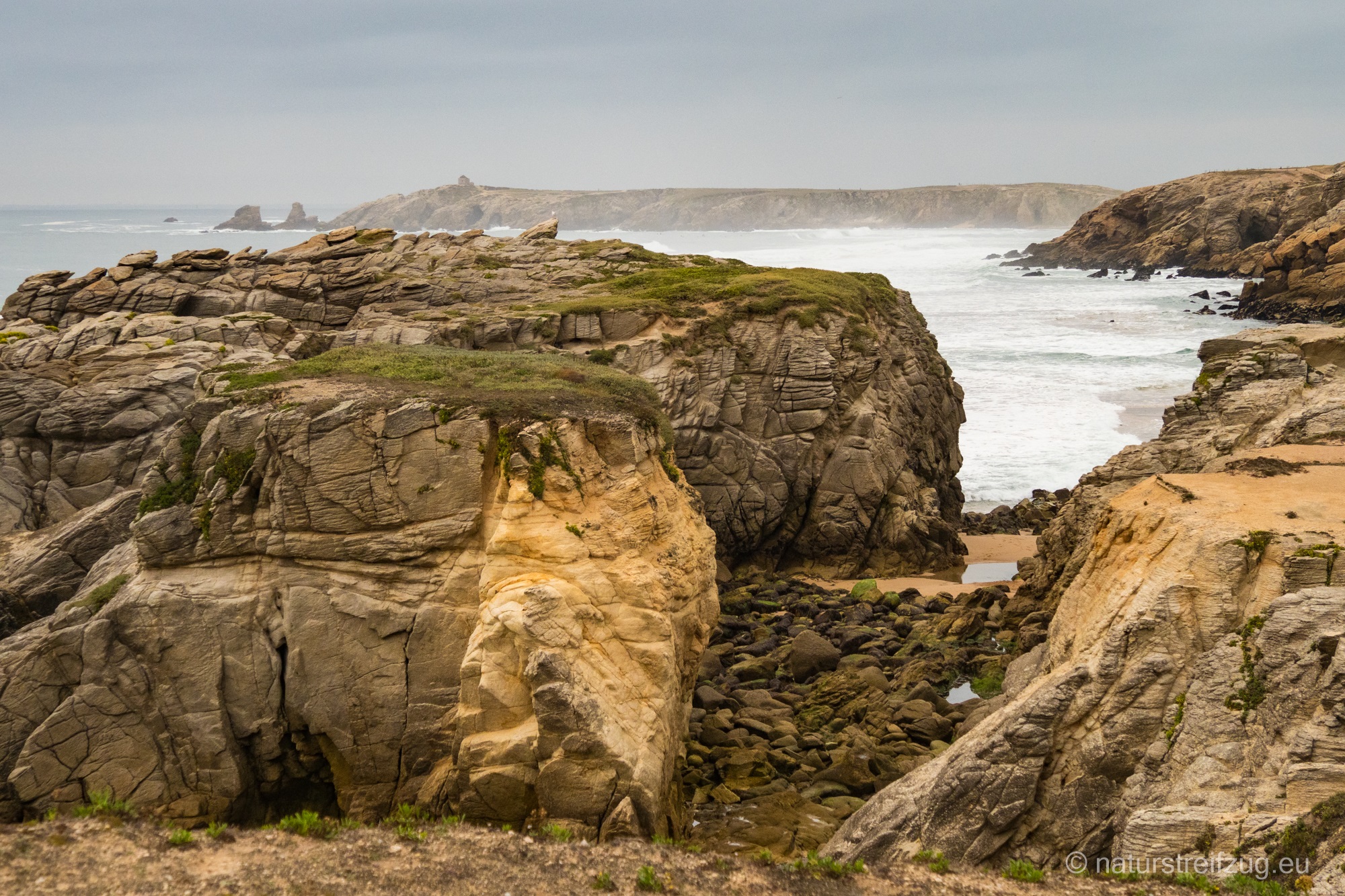 Quiberon ist über eine schmale Landbrücke aus Richtung Carnac zu erreichen. Auf der Ostseite gibt es Sandstrände, auf der anderen Seite steile Klippen. Wir parkten auf einem Wohnmobil-Parkplatz und liefen vor zur Küste. Gleich bot sich ein wunderschöner Ausblick auf ein Felsentor bei blauem Meer und Himmel. Das Meer brandete an die Küste. Eine Straße führt entlang der Küste. Überall gibt es Möglichkeiten zum Anhalten. Eine raue Bucht schöner als die andere - mit anderen Worten: Fotomotive ohne Ende.