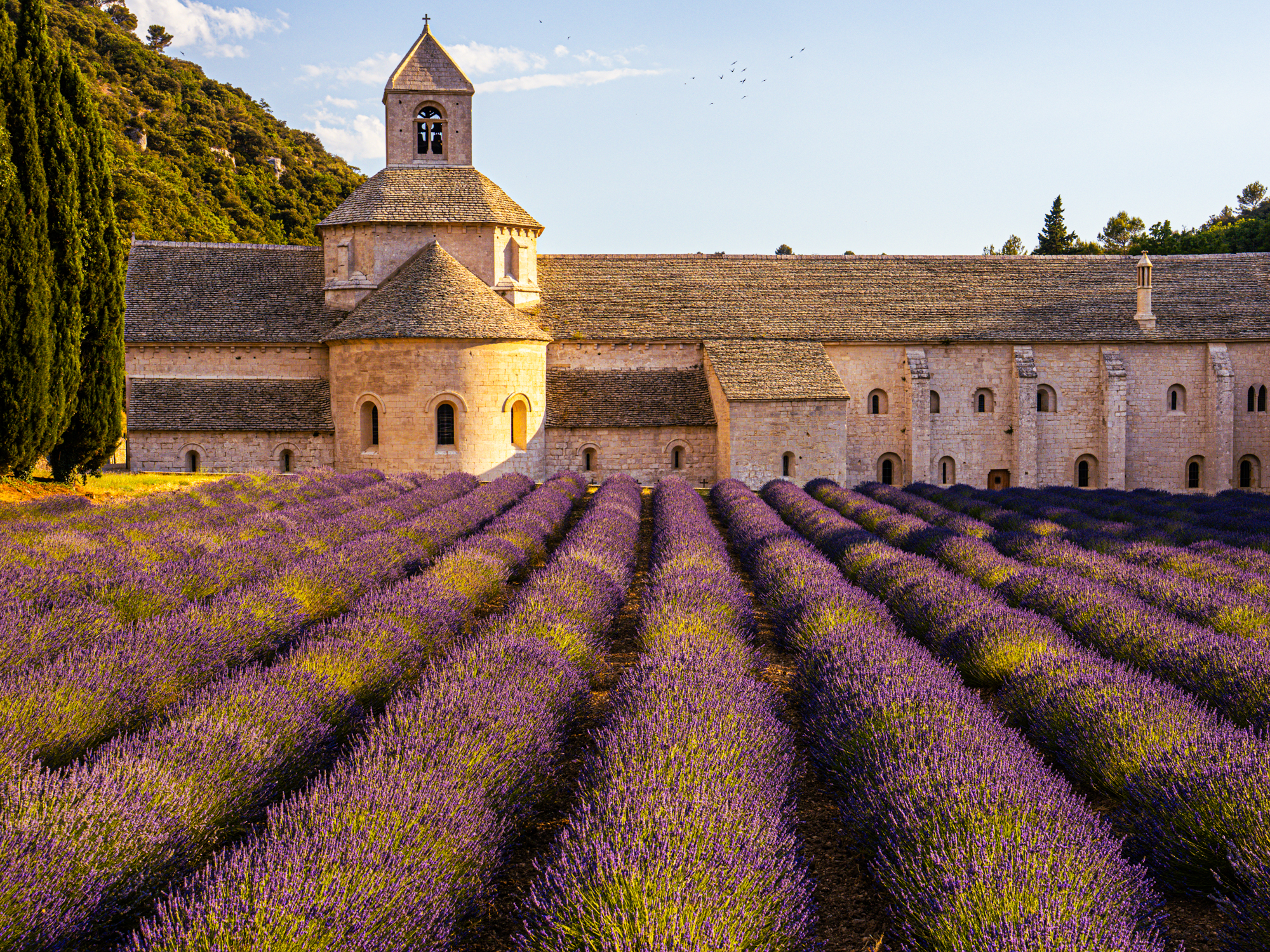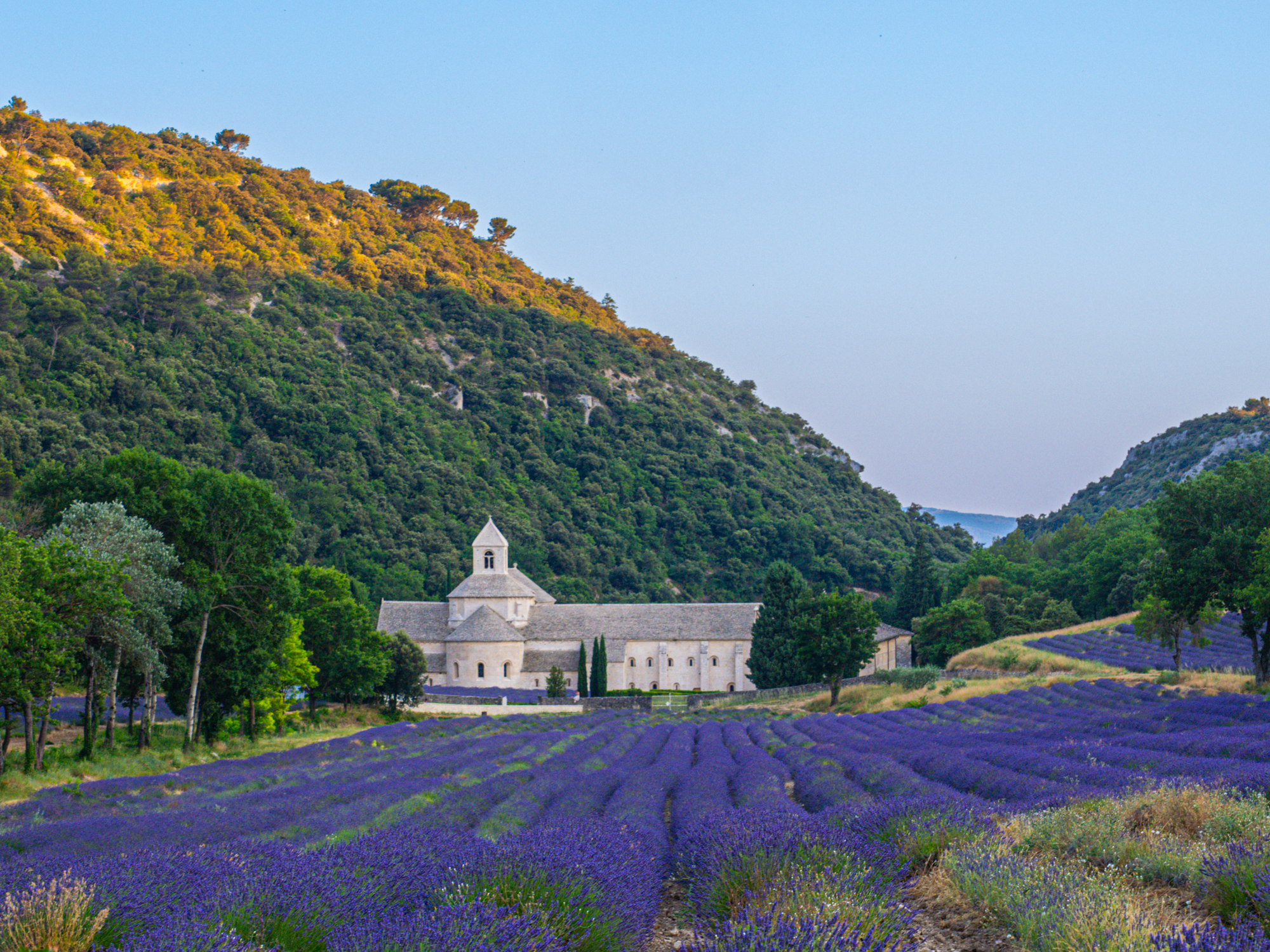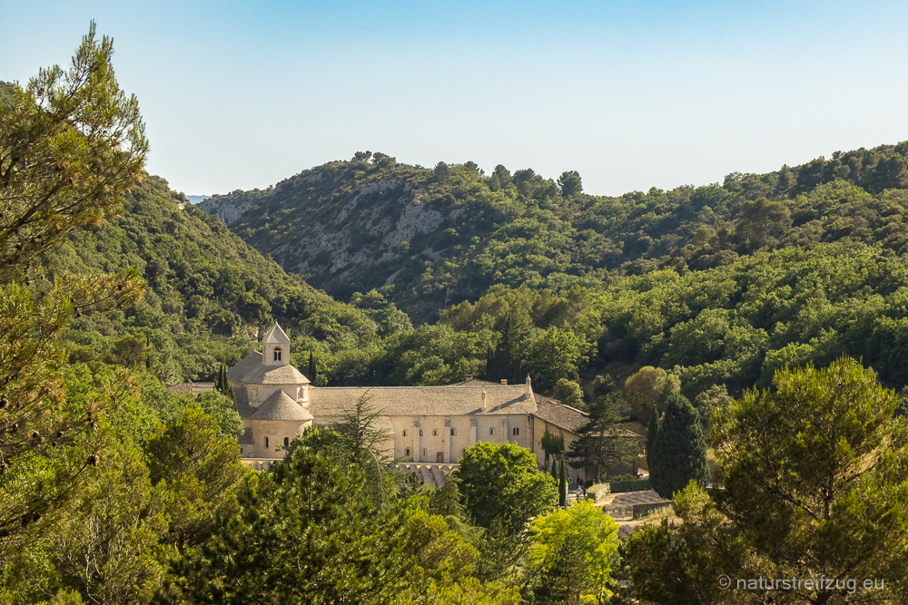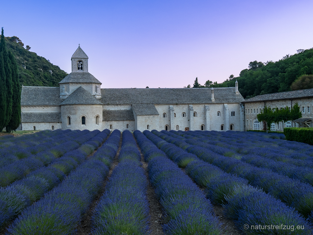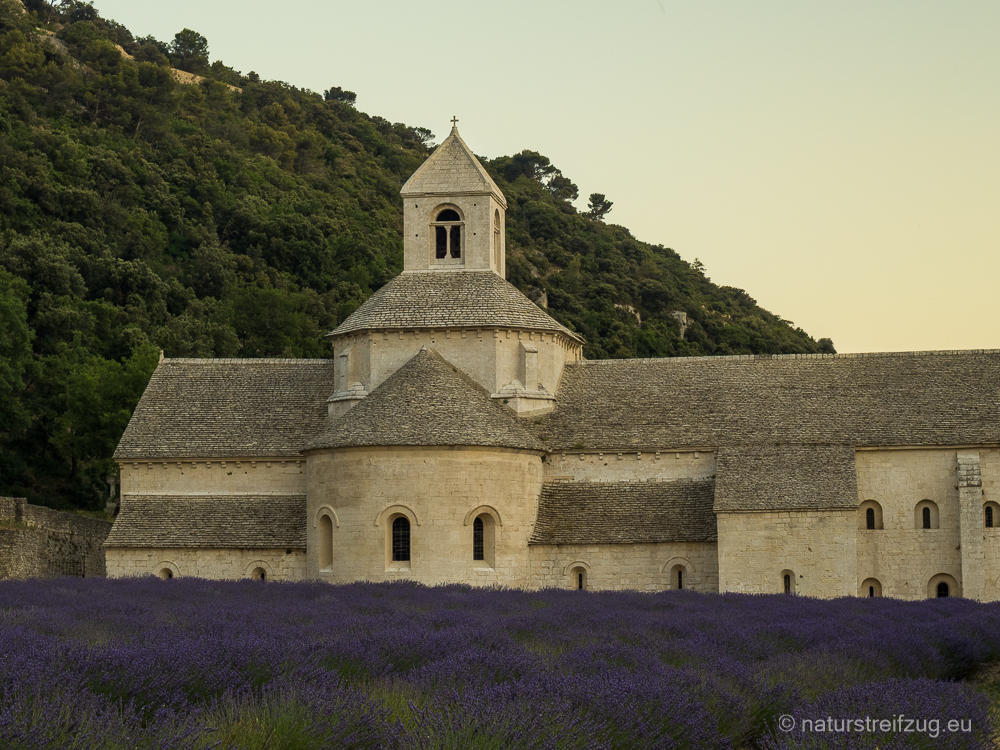 Die Abbaye de Senanque im abgeschiedenen Sénanque-Tal gehört auf jeden Fall dazu. Normalerweise ist das ein Hotspot, der zu jeder Tageszeit total überlaufen ist. Aber wir hatten Ende Juni 2025 gerade eine Woche erwischt, in der nichts los war. Die Pfingstferien-Touristen waren nicht mehr da und die Sommergäste noch nicht eingetroffen. Erst recht zum Sonnenuntergang war fast niemand mehr da, der große Parkplatz so gut wie leer.