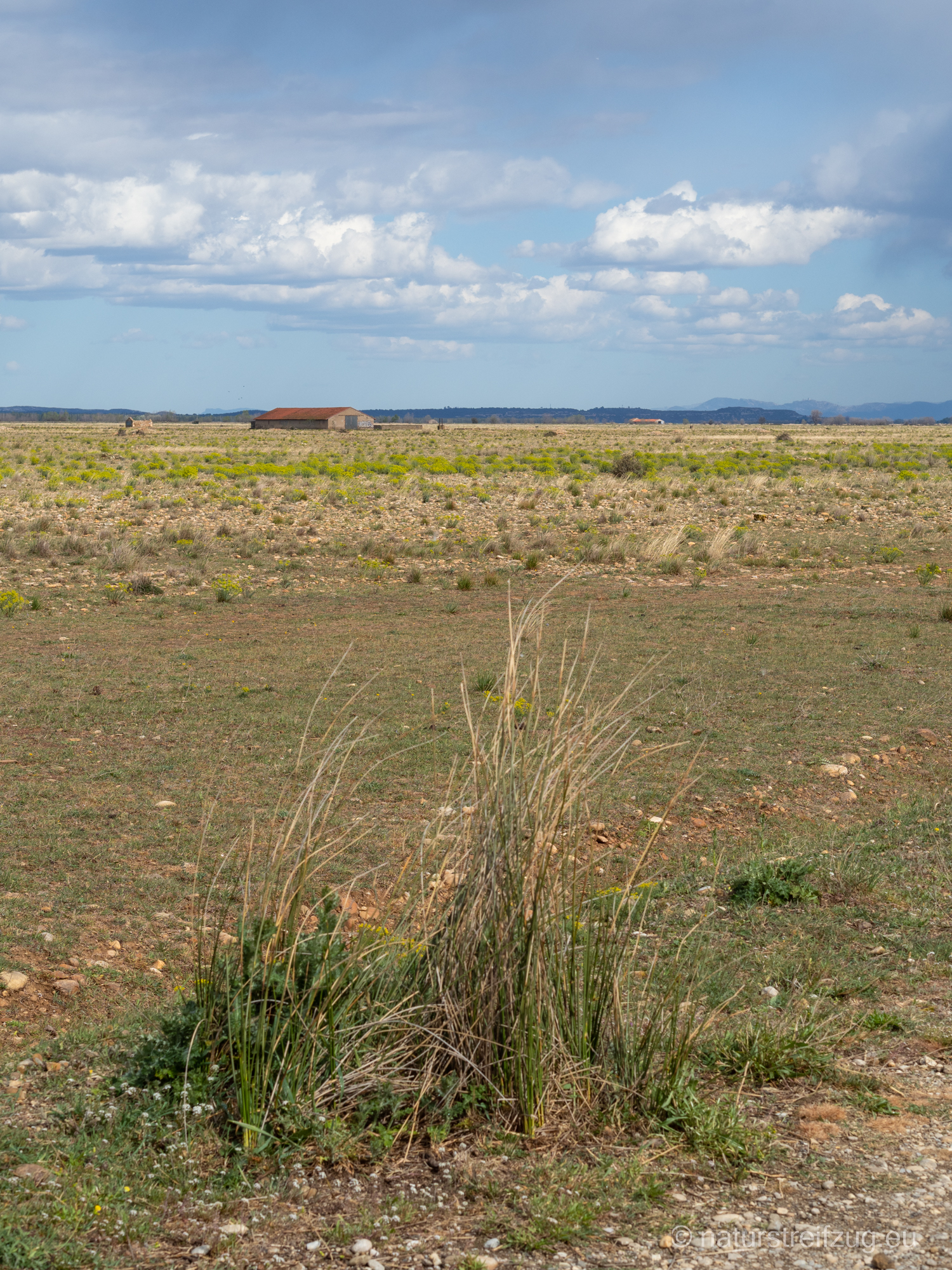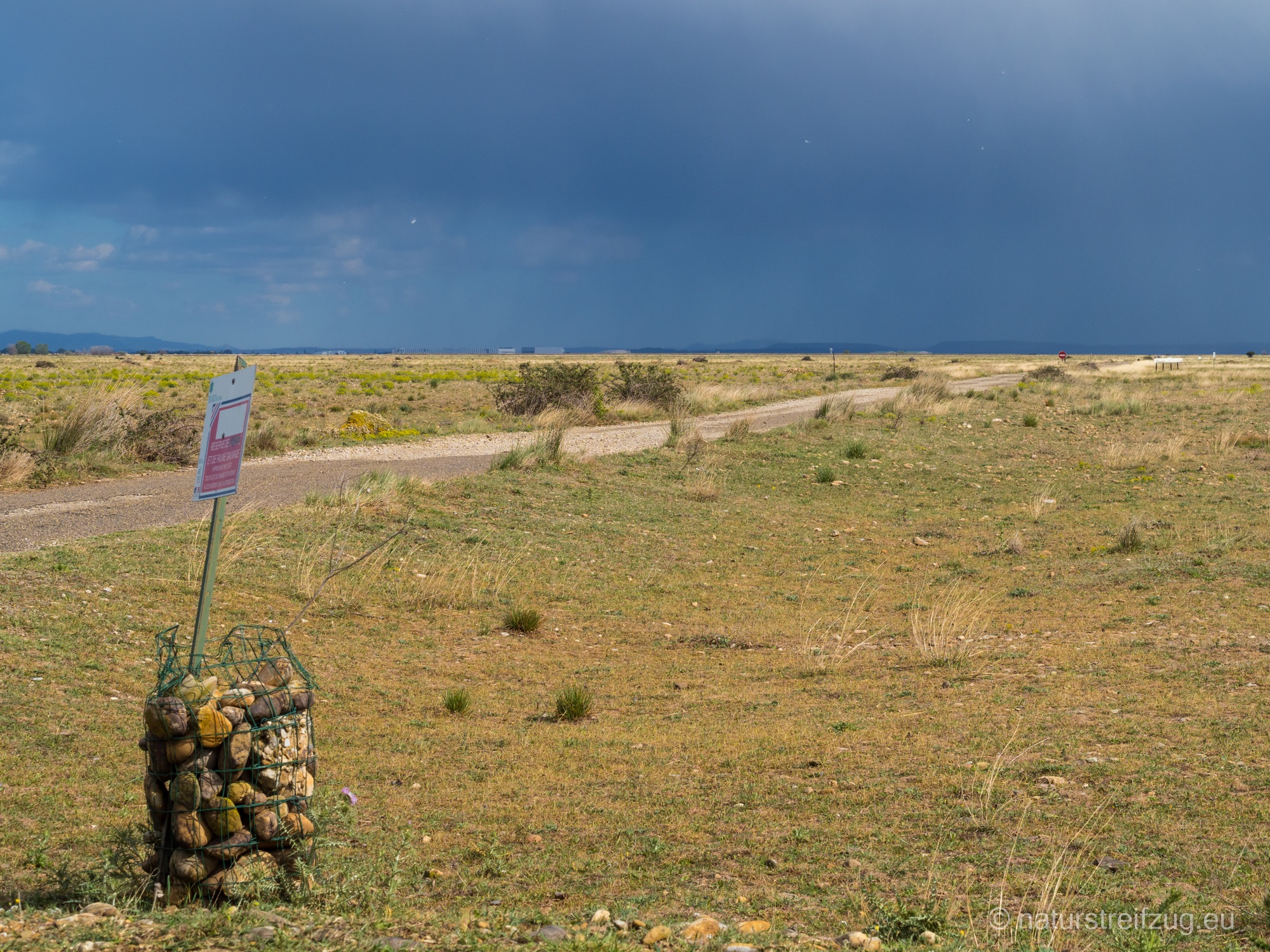 Obwohl die Crau für seltene Vogelarten wie den z. B. Triel, den Schlangenadler, Häherkuckuck, Zwergtrappe, Spiessflughuhn, Kalanderlerche bekannt ist, ist es äußerst schwierig, diese Tiere in der Steppe auszumachen. Das ist eine Gegend für Spezialisten mit Spektiv. Wir sahen leider in dieser kargen Landschaft nichts. Wir verbrachten einen ganzen Nachmittag und den darauffolgenden Morgen dort, ohne einen Vogel vor die Kamera zu bekommen. So bleiben die Landschaftsaufnahmen, um einen Eindruck von dem Gebiet zu vermitteln.