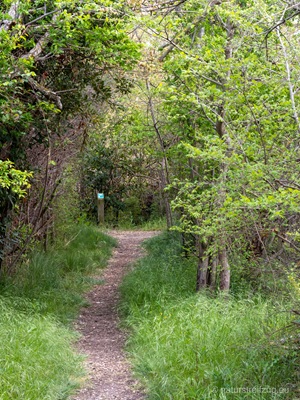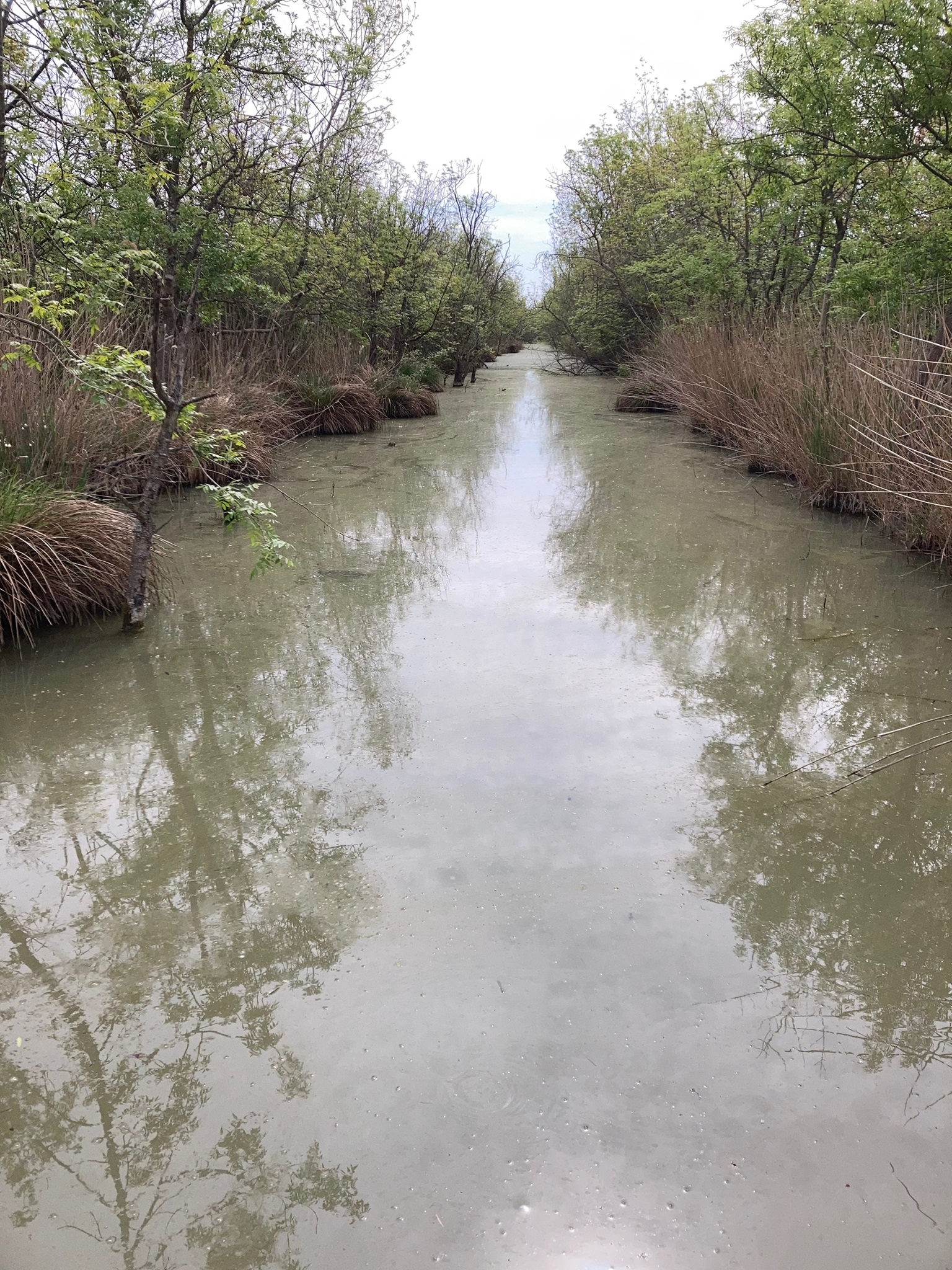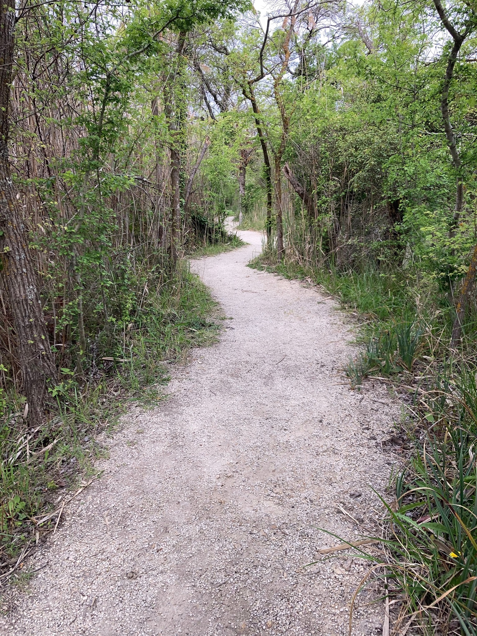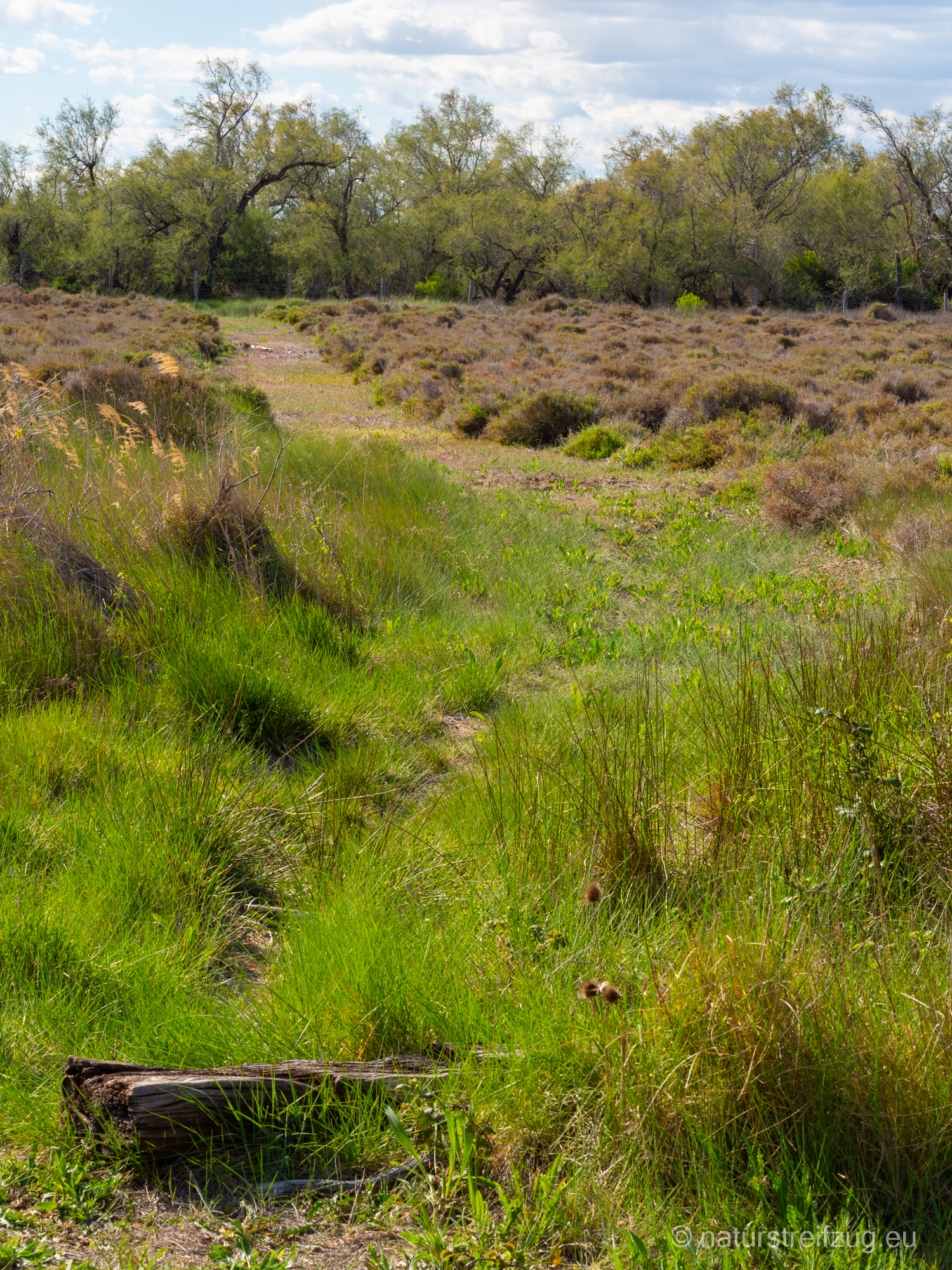 Im Reservat führt ein Rundweg durch verschiedene, typische Vegetationszonen der Camargue: Auwald, Sumpf, Teiche, Salzsteppe, Röhricht. Er führt an verschiedenen Beobachtungshütten vorbei. Wahrscheinlich würde man Vögel sehen können, aber als wir da waren blies der Mistral so stark, dass sich kaum ein Vogel dort aufhalten wollte. Eine Nachtigall tirilierte direkt über uns, ließ sich aber im Baum, der noch nicht voll belaubt war, dennoch nicht ausmachen.
