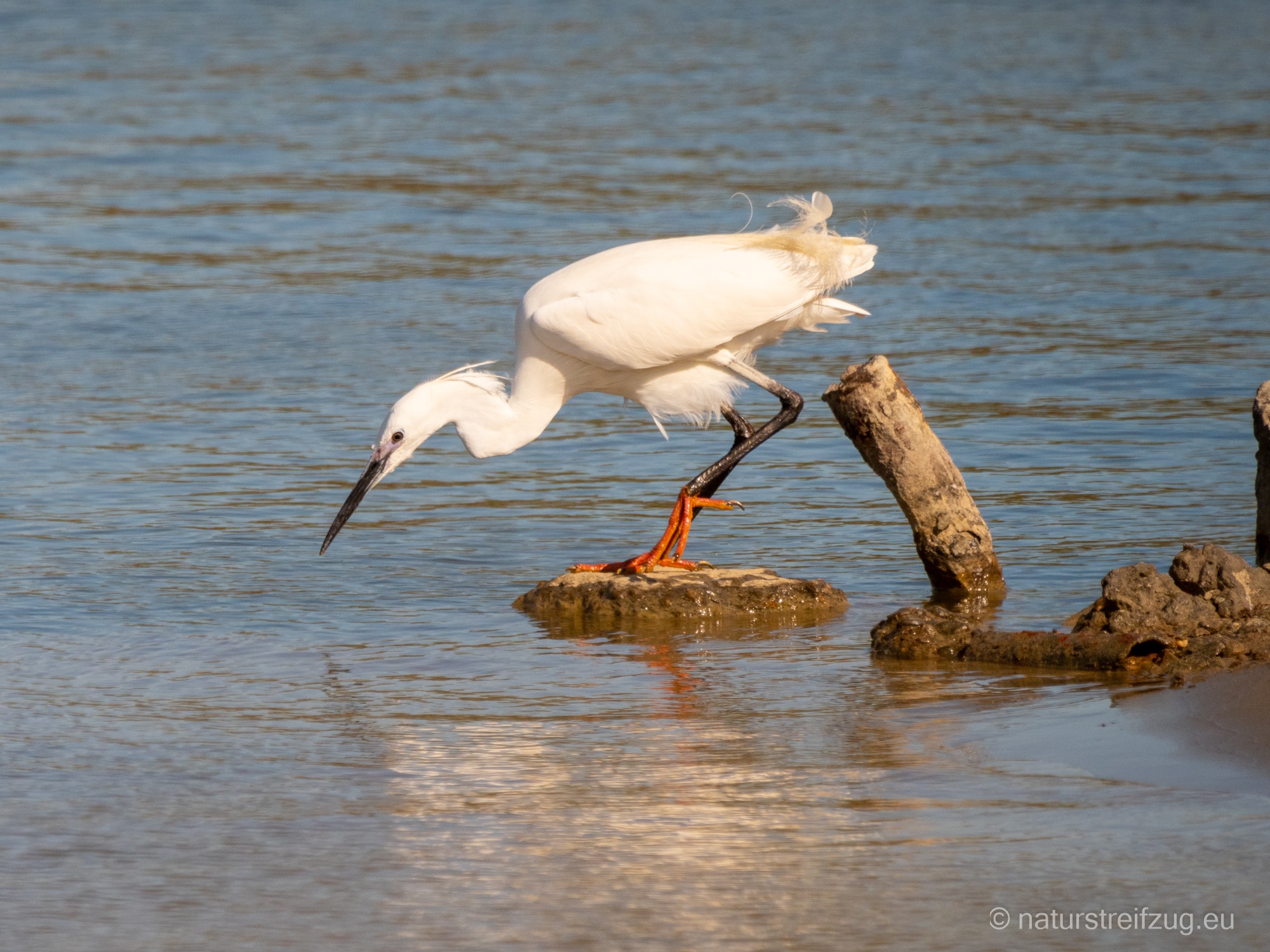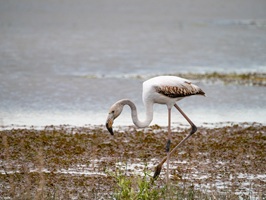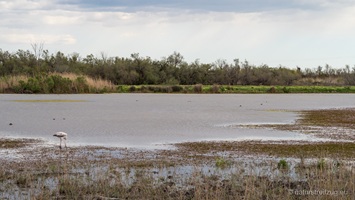 Der Etang de Fangassier in der Nähe von Saline-de-Giraud soll das größte Brutgebiet der Flamingos in Frankreich sein. Aber als wir kamen, waren nicht viele Flamingos zu sehen und von Brutgeschäft noch keine Spur. Vielleicht war es im April noch zu kalt dafür. Außerdem erschien uns der Wasserstand sehr niedrig. Es sah aus, als ob auch in den Etangs bereits Wassermangel herrscht. Manche sahen ausgetrocknet aus. Zudem tobte der Mistral immer noch so sehr, dass wir uns kaum draußen aufhalten konnten. Immerhin entdeckten wir einen Rotschenkel und ein Silberreiher beim Fischfang beschäftigte uns auch eine Zeitlang.