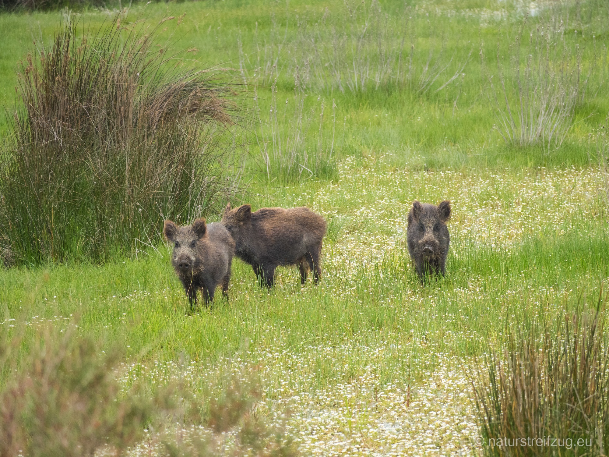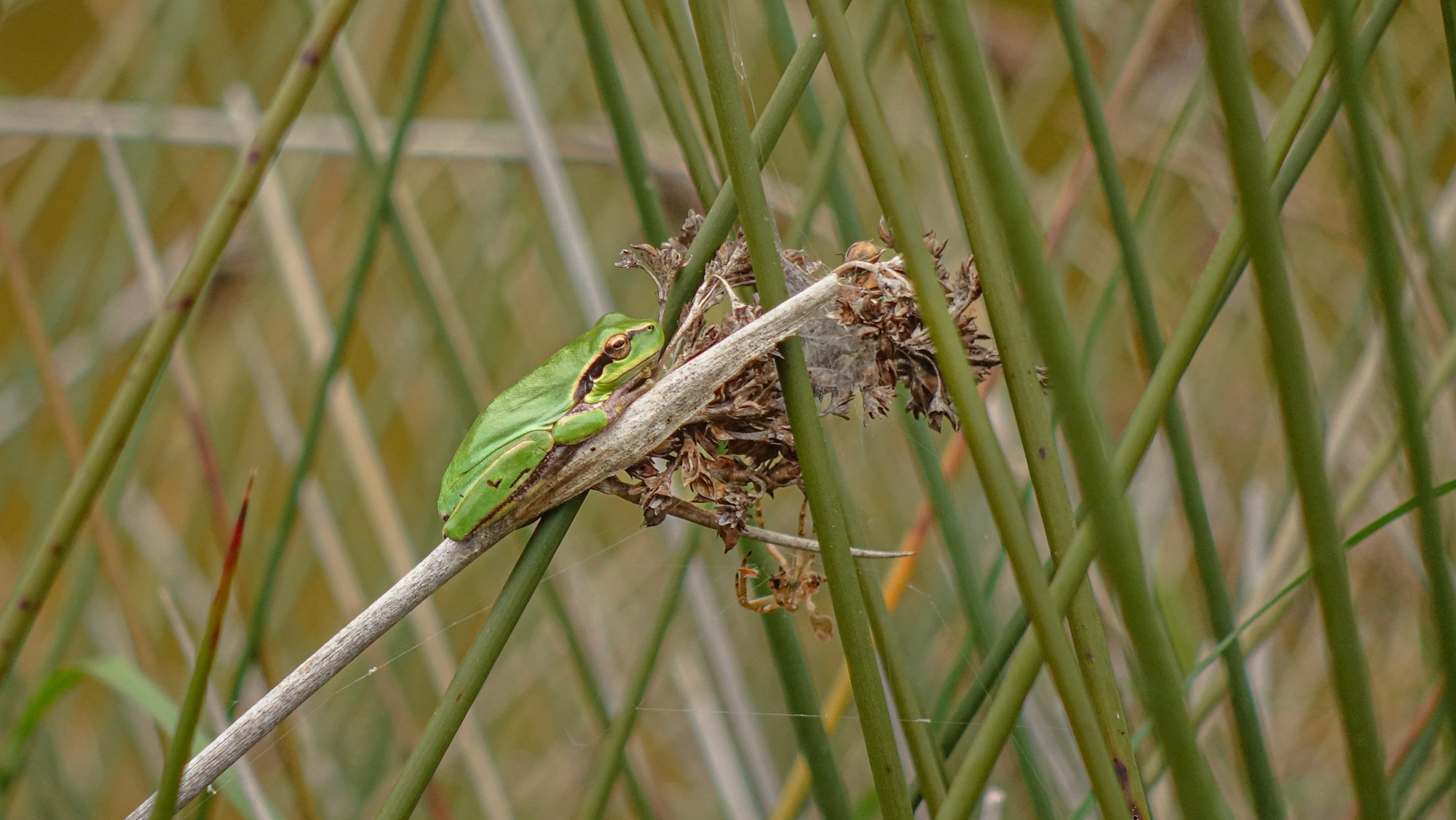 Der Höhepunkt war für uns ein Häherkuckuck, der leider etwas weit weg war. Ansonsten gab es eher Stiere, Wildschweine und Pferde zu sehen. Und als einen weiteren Höhepunkt einen Laubfrosch, der sich an Halmen festklammerte. Erst beim genaueren Betrachten der Fotos zuhause entdeckten wir, dass wir zudem einen Nachtreiher im Flug erwischt hatten.