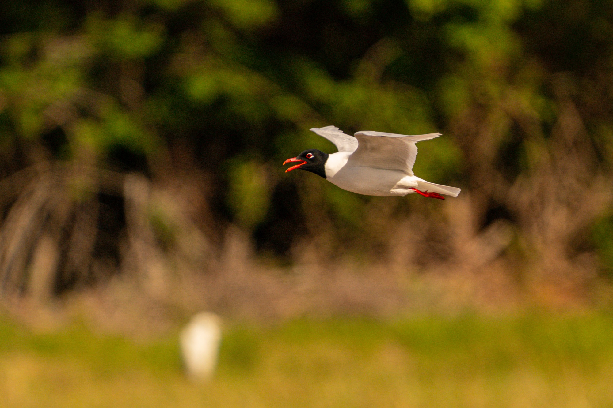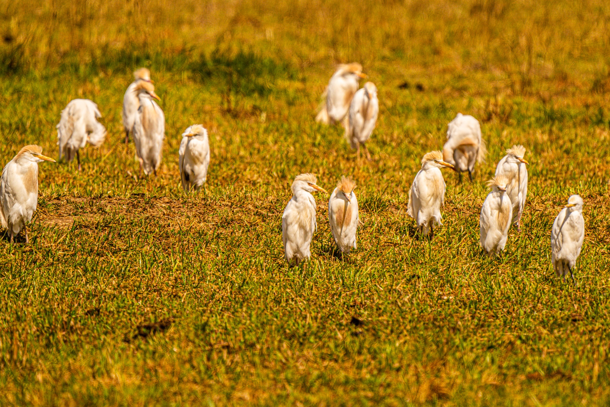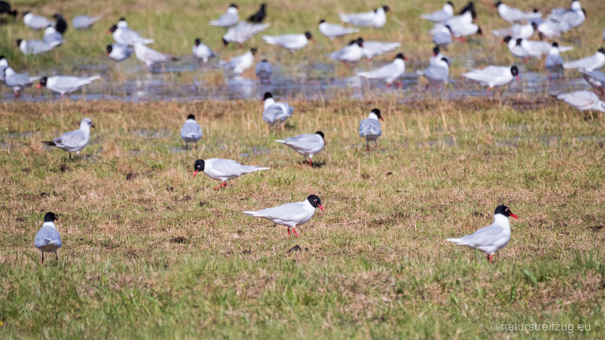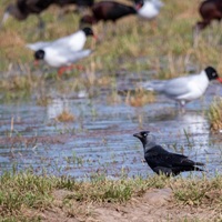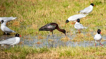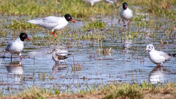 Dieses besonders sensible Gebiet darf nicht ohne Genehmigung betreten werden. Man muss vorher im Ecomusée Saint Martin-de-Crau eine Lizenz erwerben, die ein zweitägiges Betreten des Rundweges in der Crau erlaubt. Wir mussten ein wenig suchen, bis wir den schmalen Weg fanden, der zu dieser trockenen, steppenartigen Landschaft führt. Kurz vor dem Parkplatz kamen wir an einer Sumpfwiese vorbei, auf der sich eine ganze Bande Kuhreiher und Schwarzkopfmöwen niedergelassen hatte. Auch Dohlen, Ibisse und Grünschenkel waren mit von der Partie.