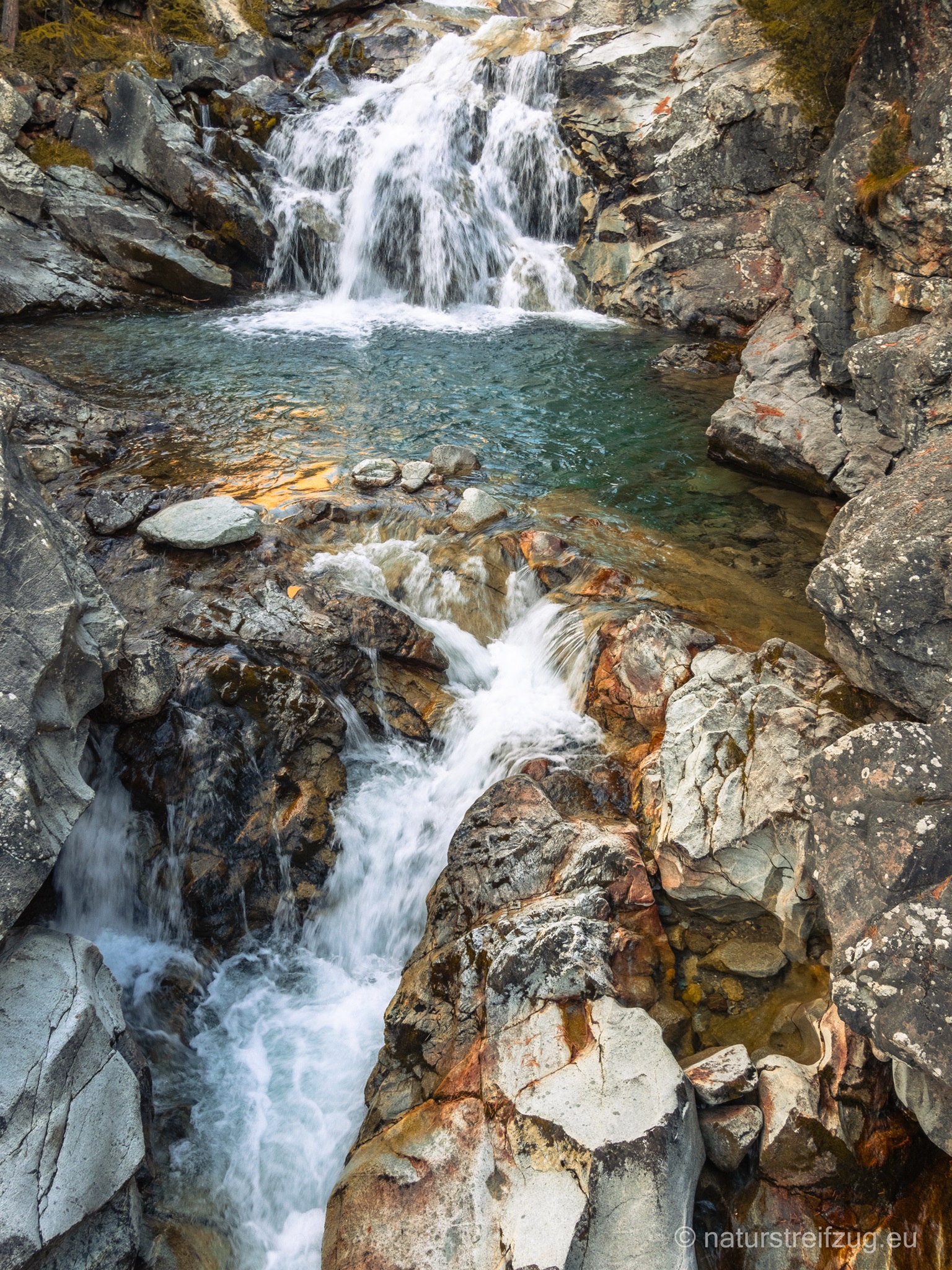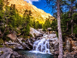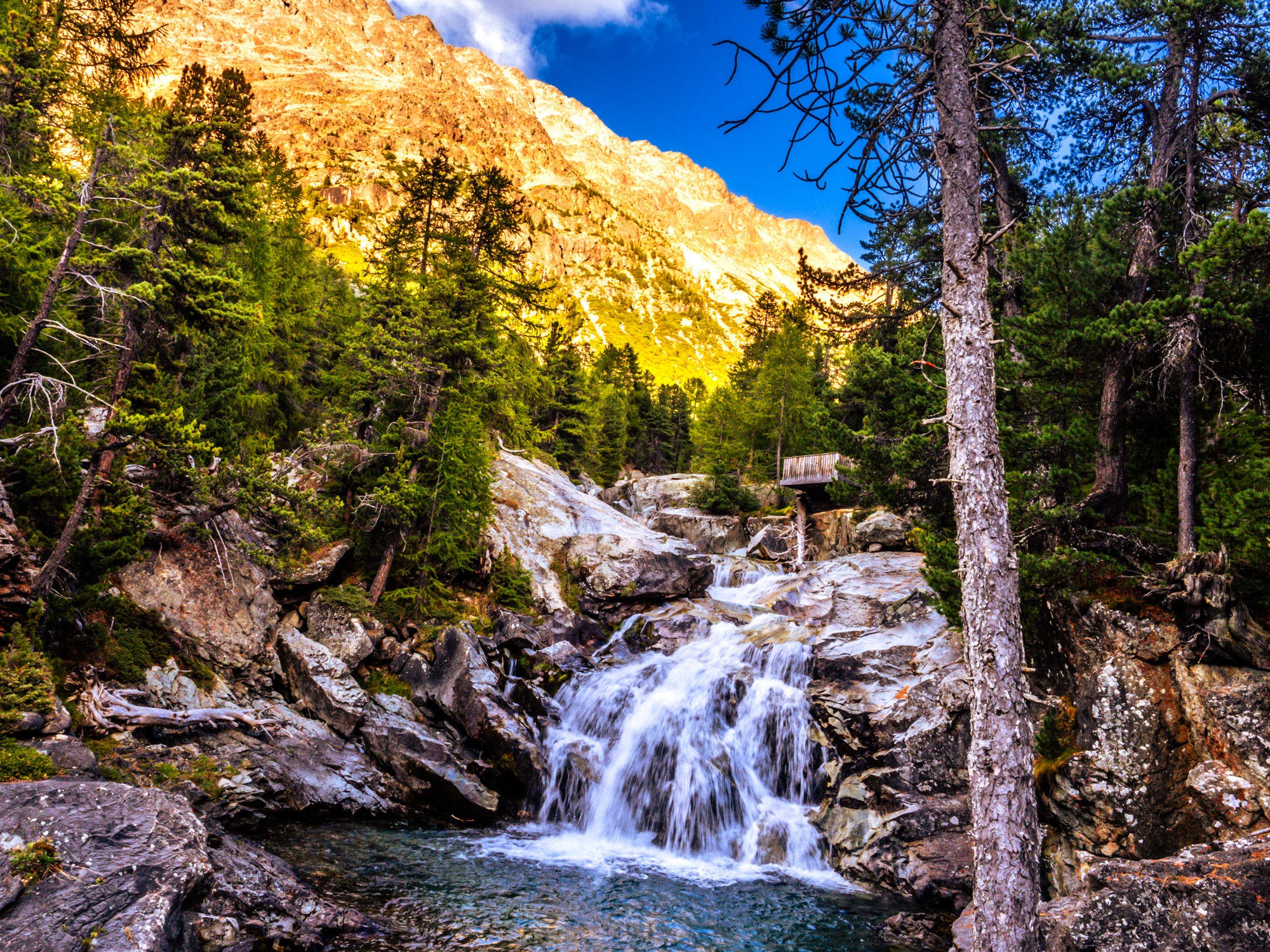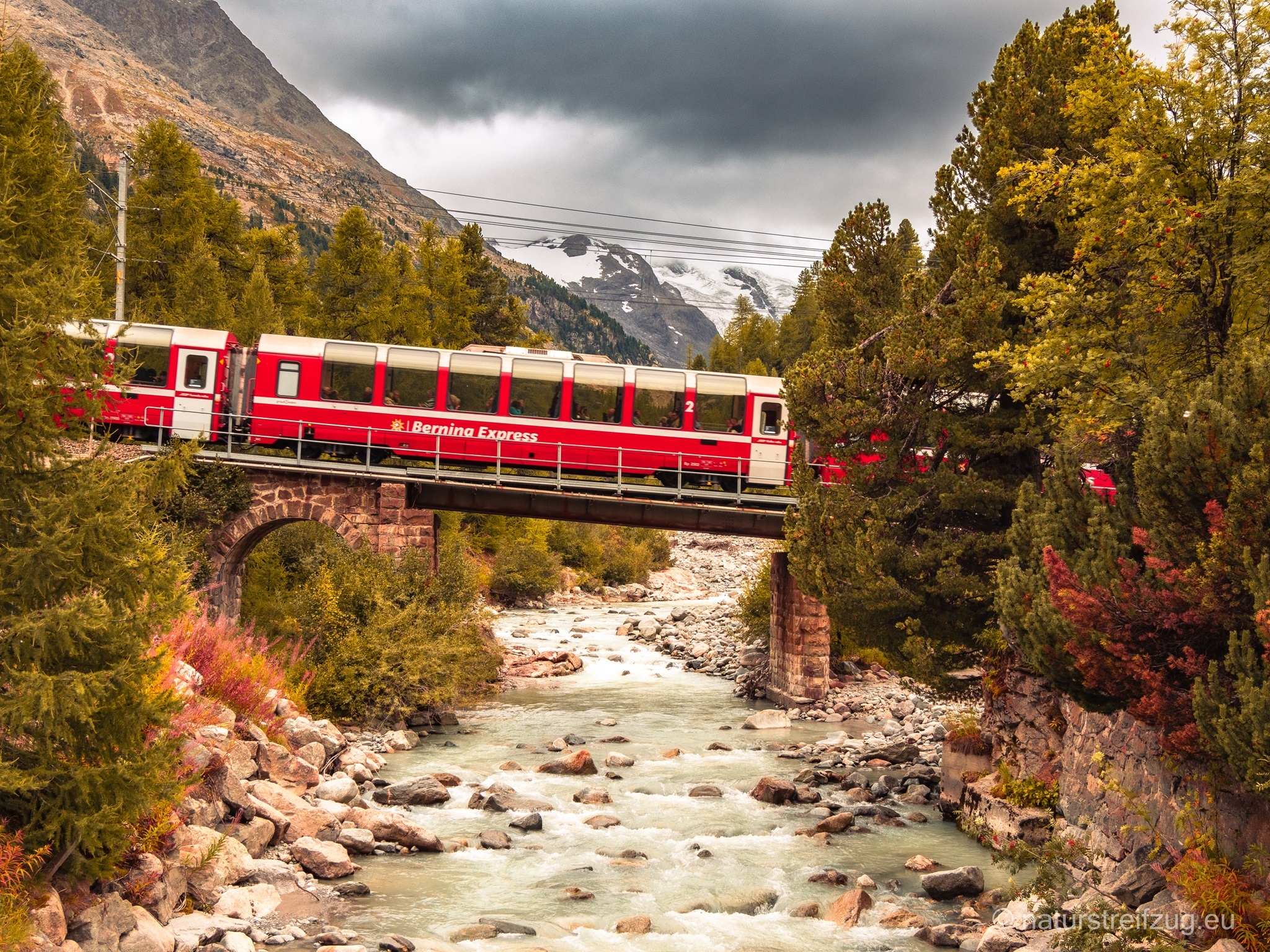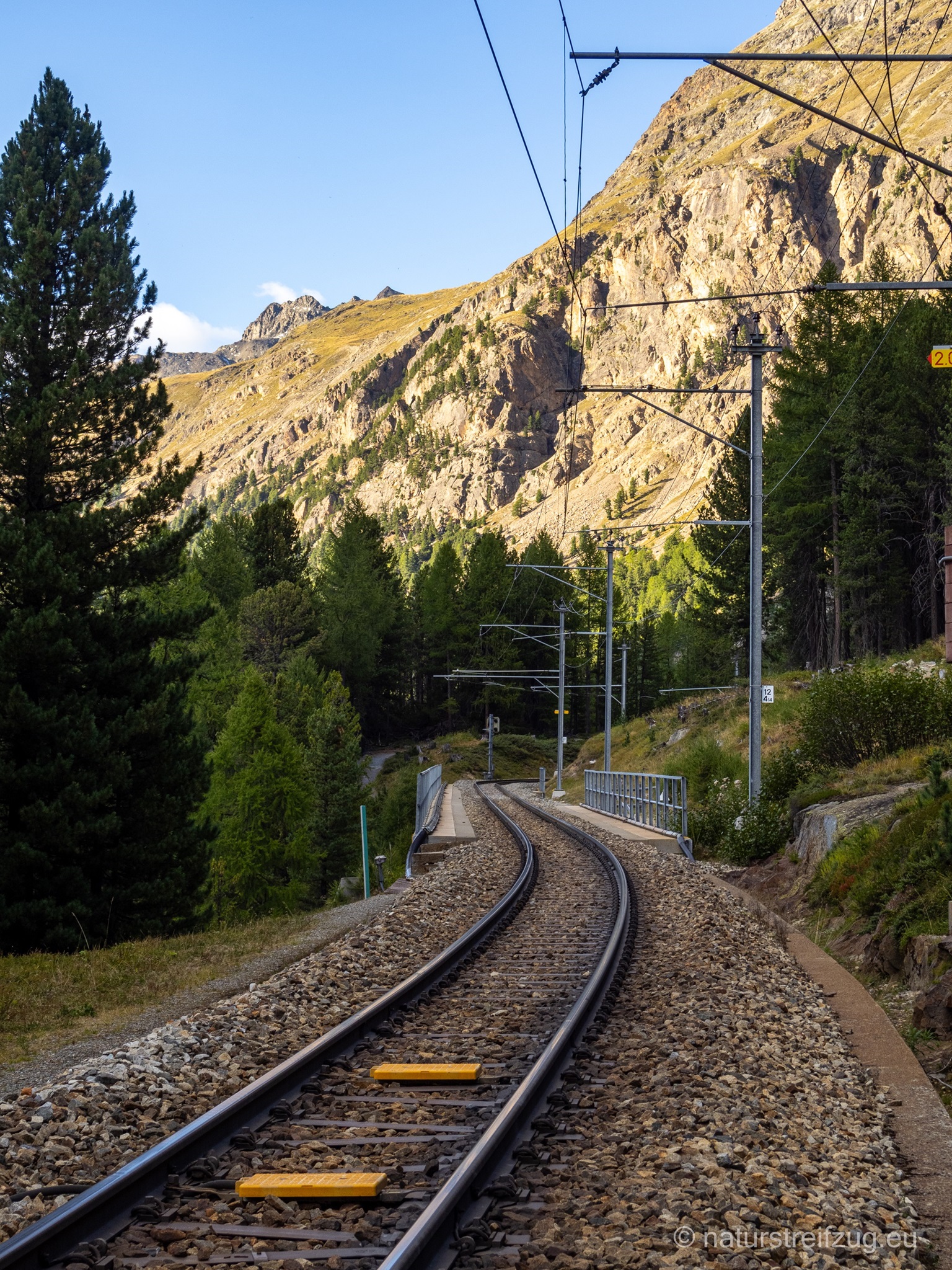 Vom Parkplatz vor der Bahnstation geht der Wasserfallweg "Cascada da Bernina" ab. Die Wanderung führt hinauf zu mehreren Wasserfall-Plattformen. Ganz nah führt die Bahnlinie der Rhätischen Bahn in engen Kurven vorbei.