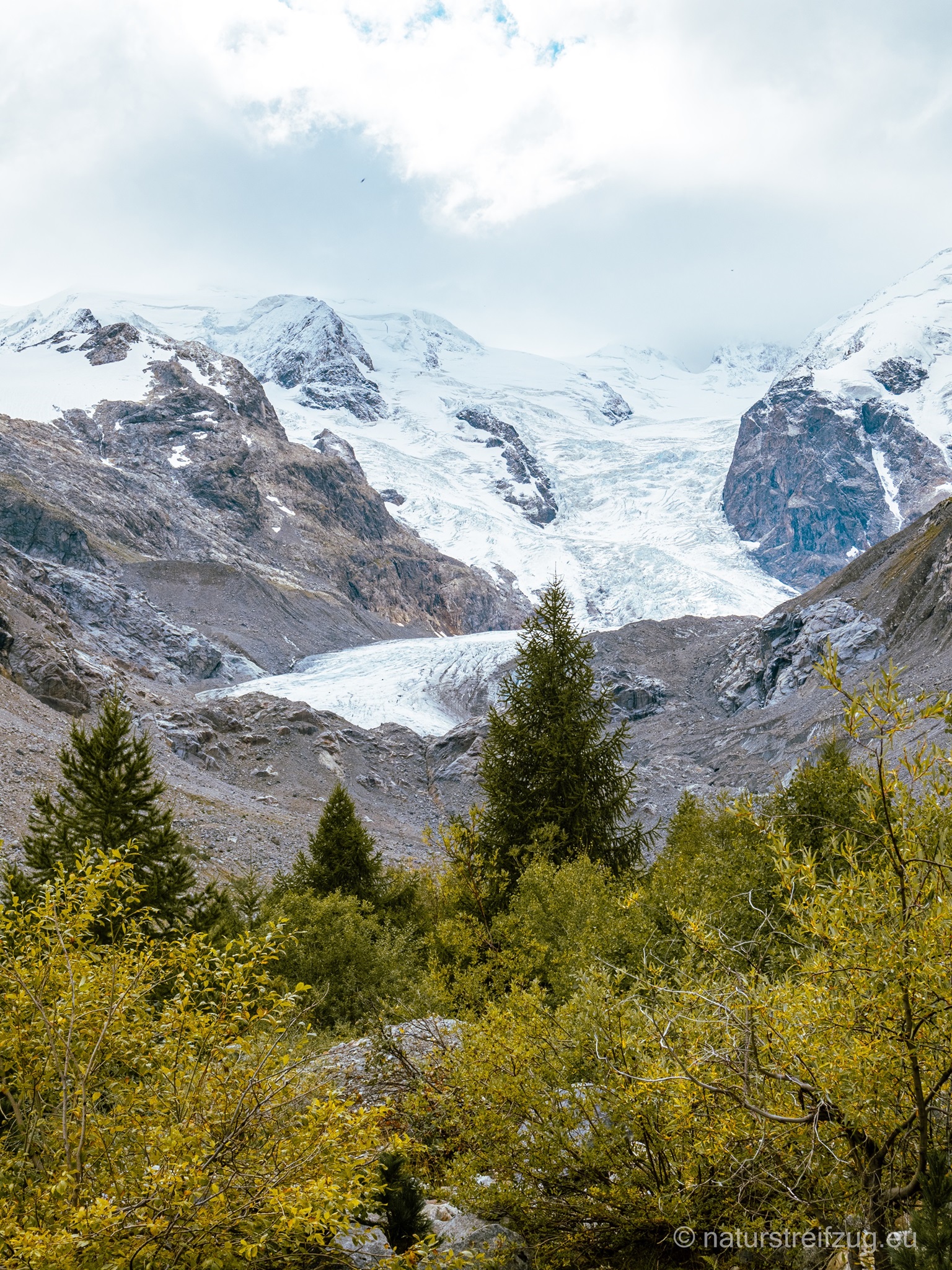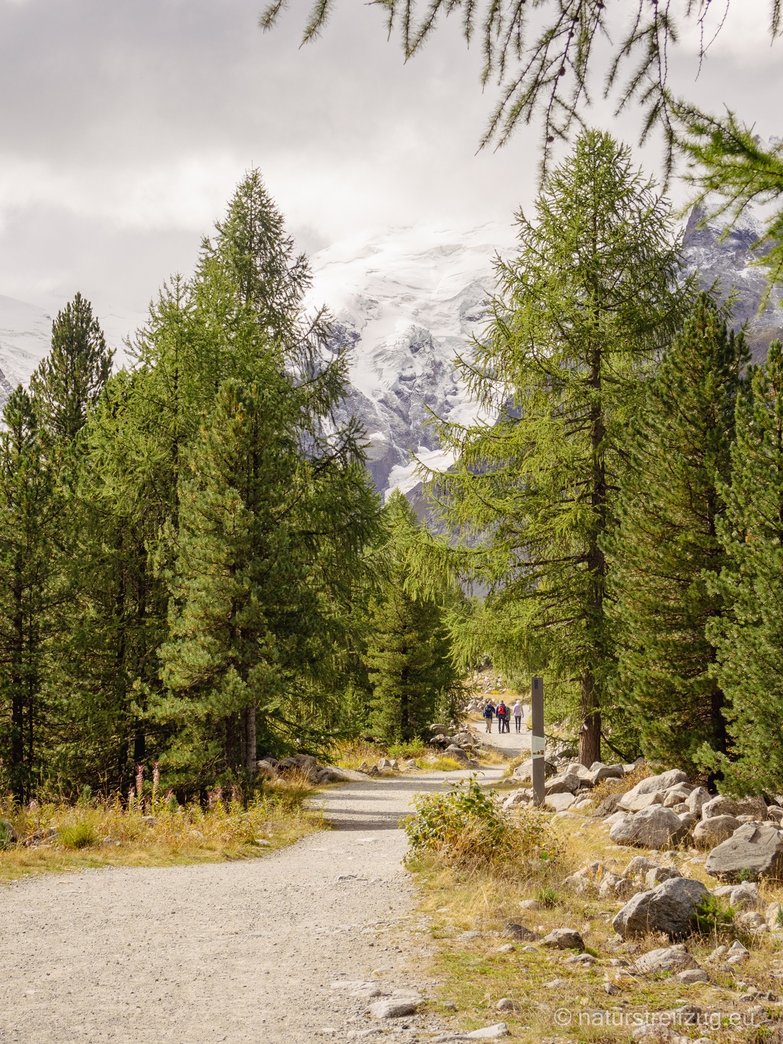 Von der Bahnstation Morteratsch und dem Morteratsch-Hotel aus kann man auf einem gut begehbaren Weg in die Nähe des Gletschers wandern. Wer die Gletscherzunge aus der Nähe bewundern will, muss noch einen beschwerlichen Aufstieg über Geröll auf sich nehmen, denn der Gletscher hat sich in den letzten zwanzig Jahren erschreckend weit zurückgezogen. Früher brauchte man vom Hotel nicht weit bis zur Gletscherzunge zu gehen, heute muss dafür ein viel länger Weg in Kauf genommen werden.