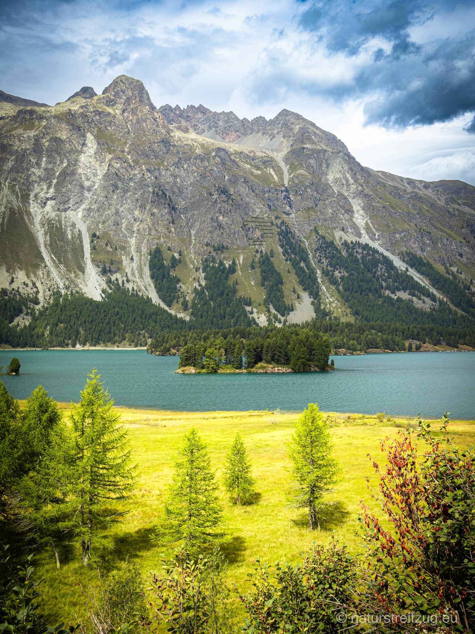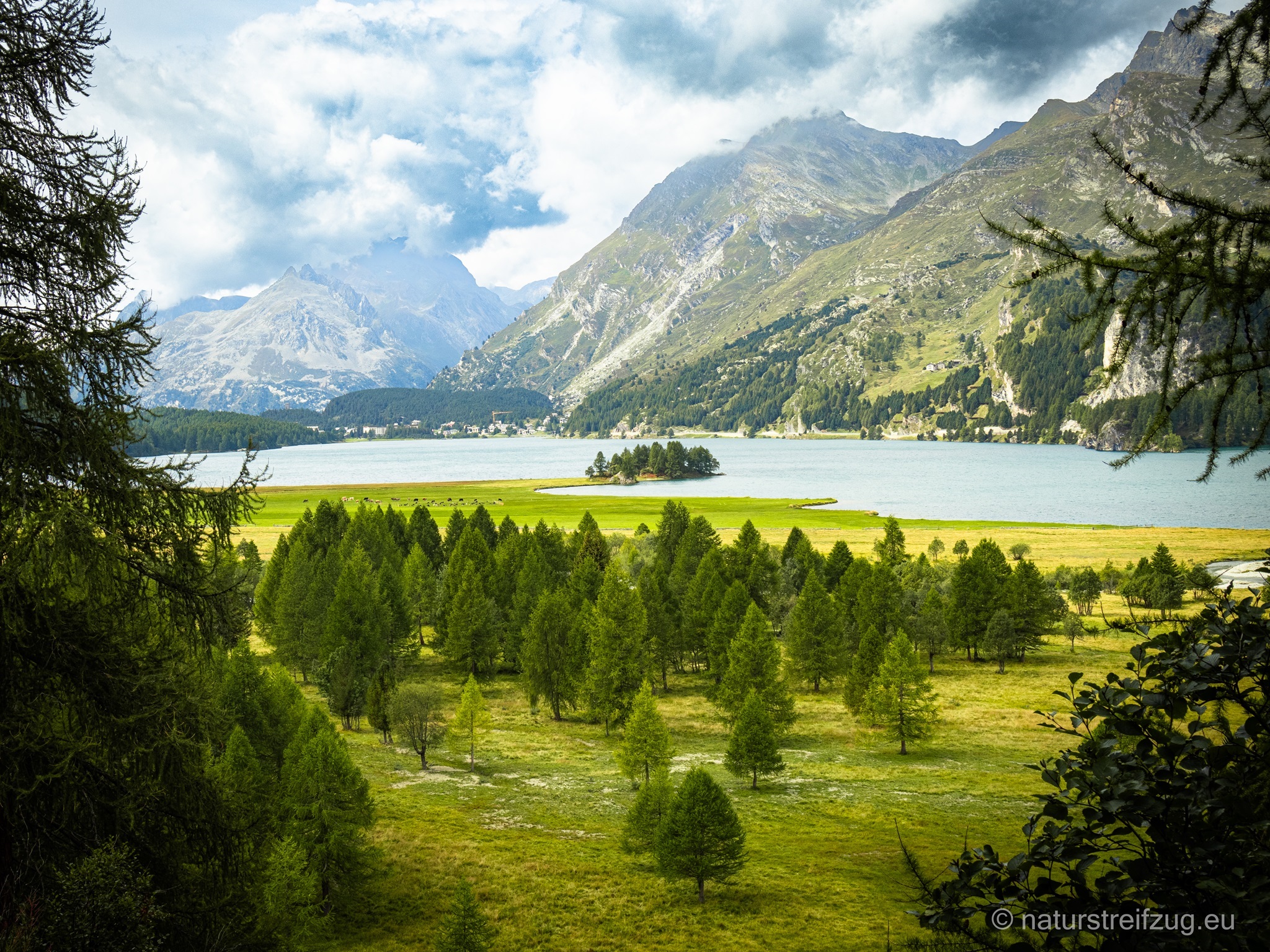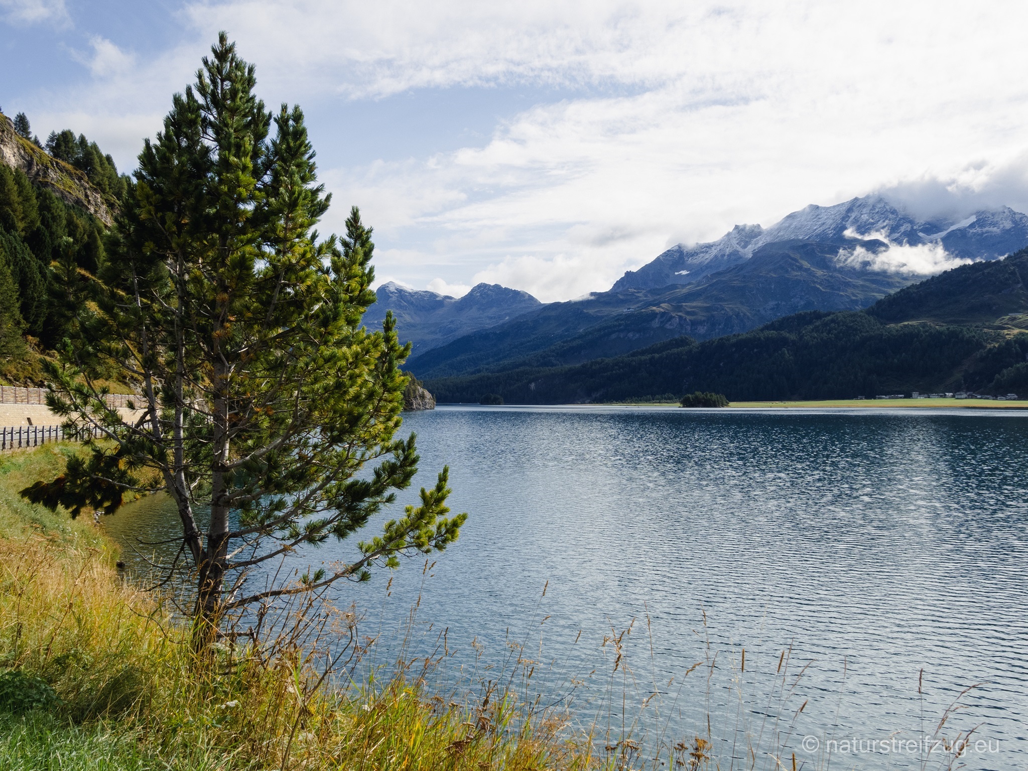 führt ein idyllischer Wanderweg. Immer wieder gibt es schöne Ausblicke. Der Silser See ist der größte See im Kanton Graubünden. In den Sommermonaten gibt es sogar einen regelmäßigen Schiffsverkehr auf der höchstgelegenen Schifffahrtslinie Europas.