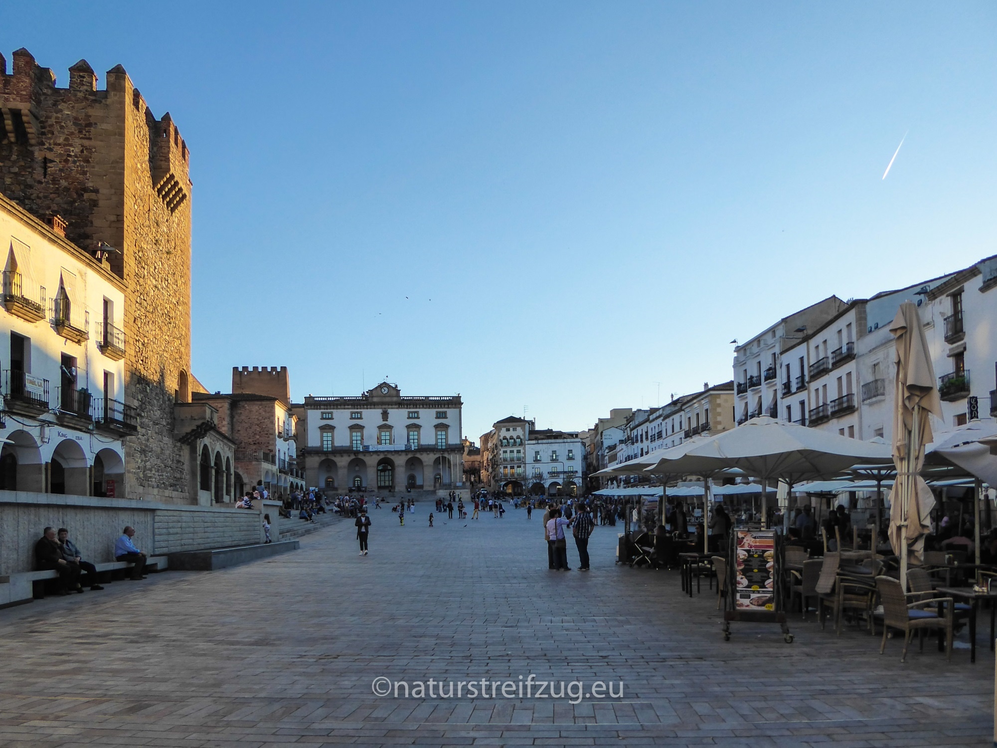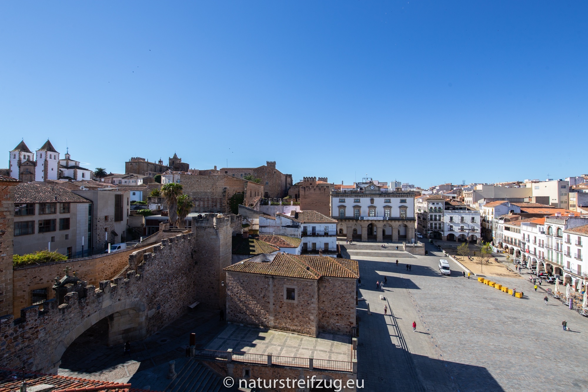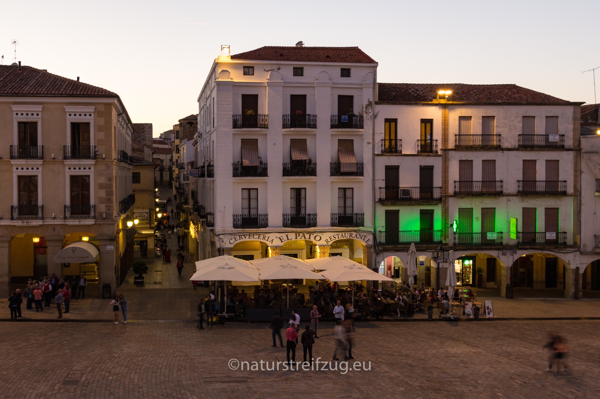 Am Morgen ist die Stadt weitgehend leer, jedenfalls zu der Zeit, in der wir da waren. So kann man in der historischen Altstadt ungestört herumschlendern und Aufnahmen machen ohne dass ständig jemand ins Bild läuft. Am Abend füllt sich der Plaza Mayor. Die Spanier treffen sich zum Reden, Essen, Trinken. Viele junge Leute sorgen in der Stadt und den Bars für Leben, denn Cáceres ist auch Universitätsstadt.