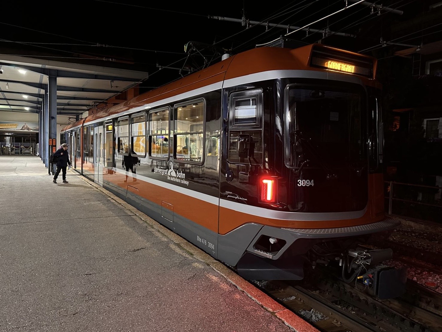 Pünktlich fuhr die Bahn ab (Schweiz eben!). Nach einer Weile wurde das Licht ausgeschaltet und am vorbeiziehenden Matterhorn konnte man in der Dämmerung bei genauem Hinsehen kleine Lichter der Bergsteiger erkennen, die auf dem Weg zum Gipfel waren.