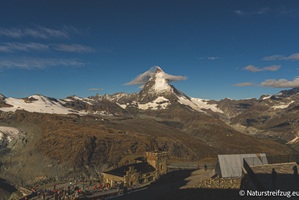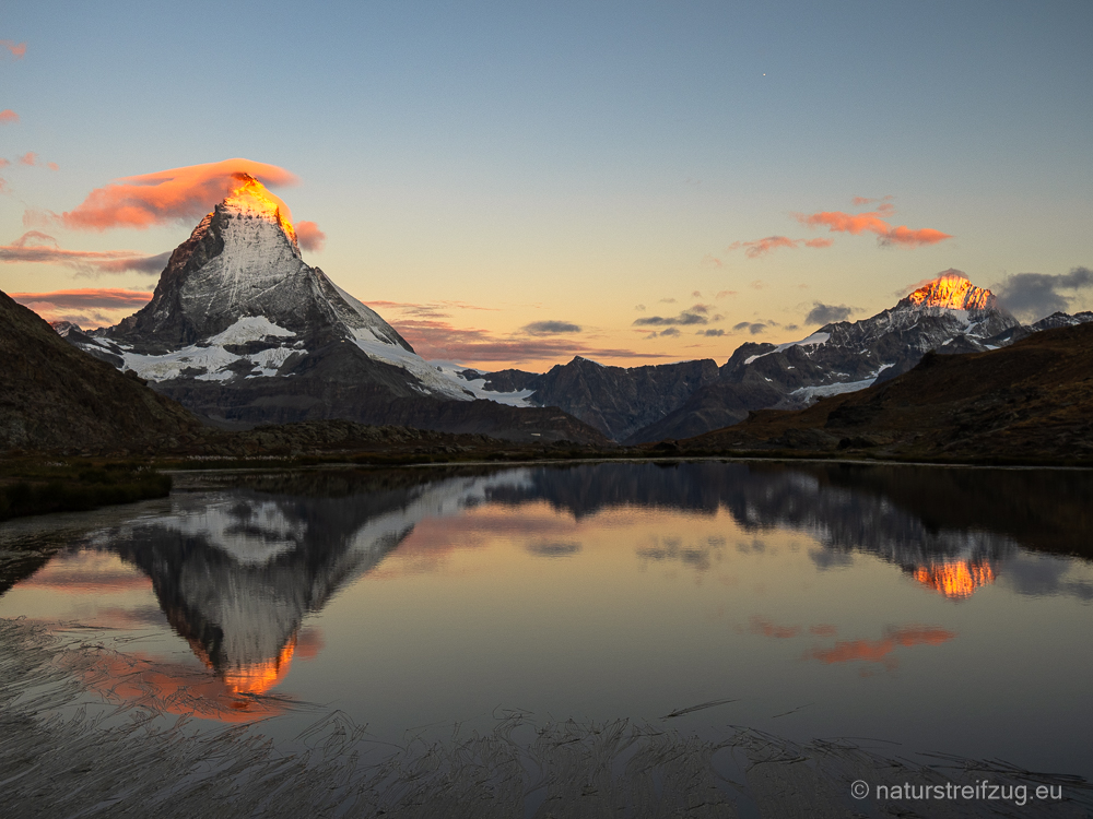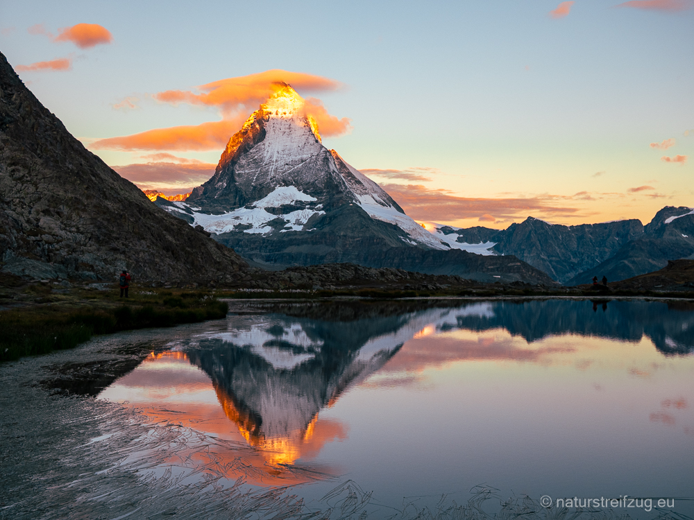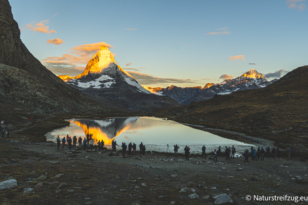 Von der Station Rotenboden waren es noch 10 min abwärts bis zum Riffelsee zu laufen. Genug Zeit blieb übrig, um die Kameras zu richten und darauf zu warten, bis die ersten Sonnenstrahlen die Matterhorn-Spitze beleuchteten und sich das ganze Geschehen im Riffelsee spiegelte - ein magischer Moment.