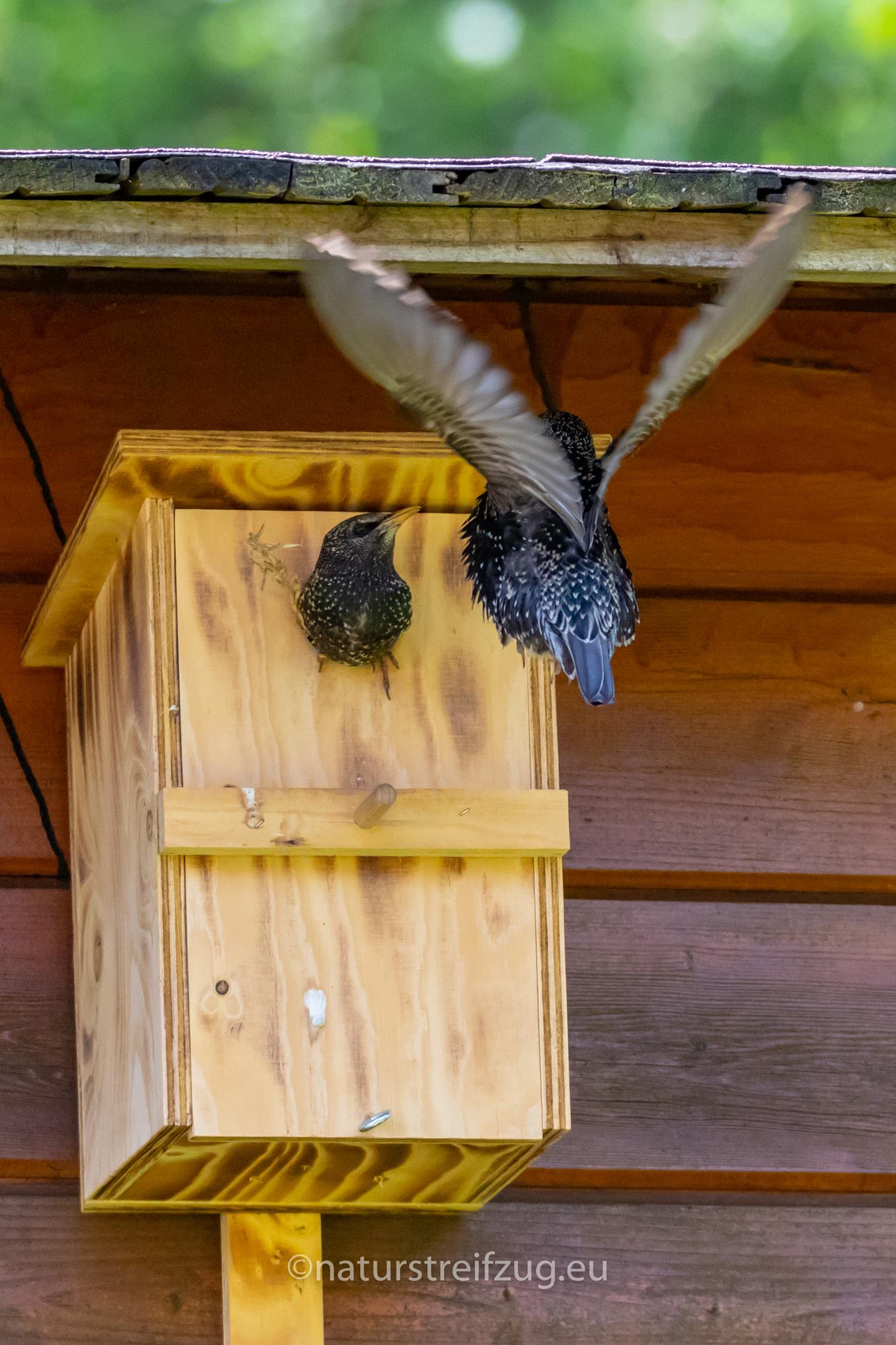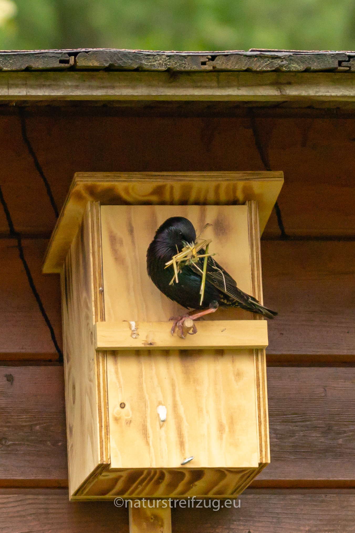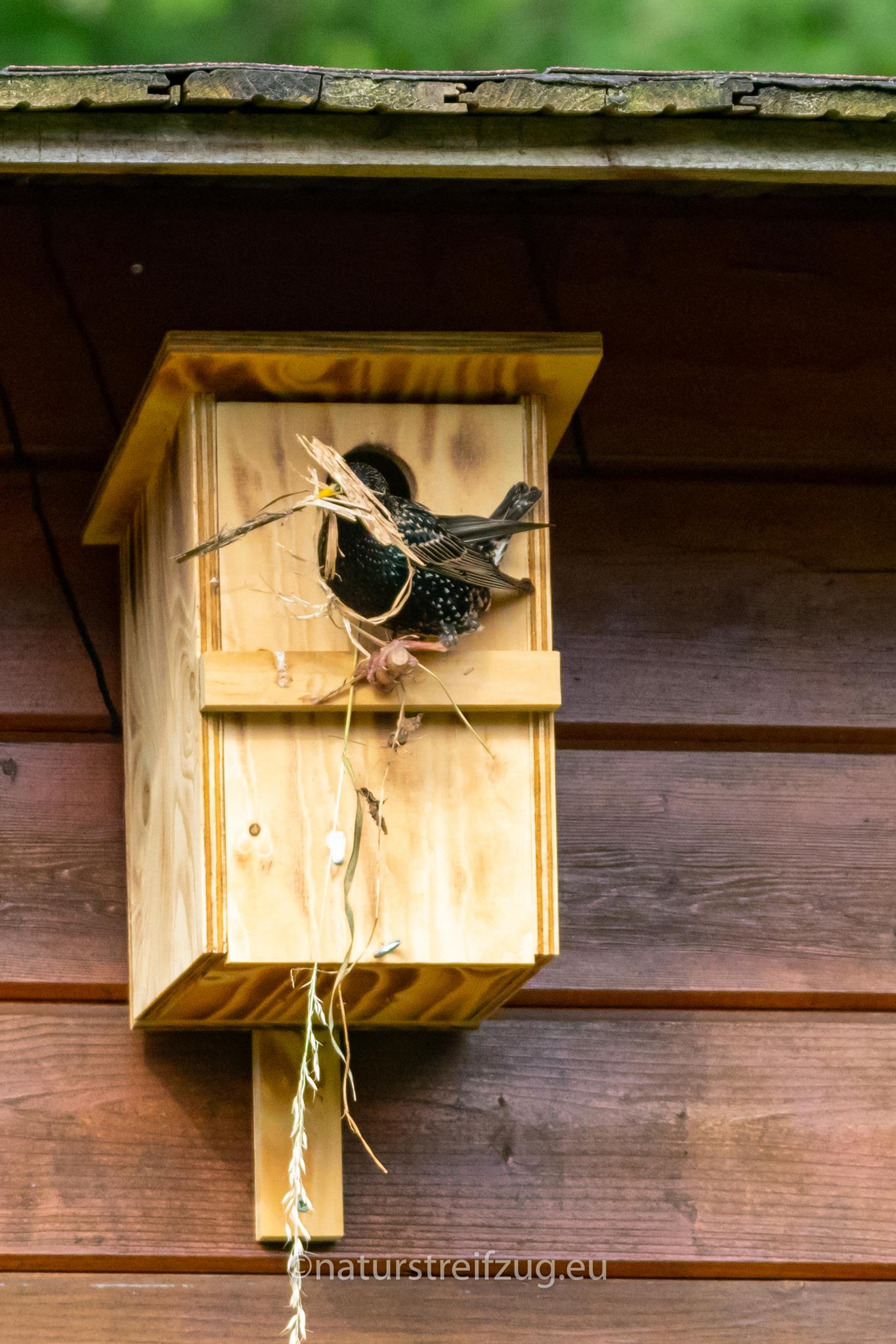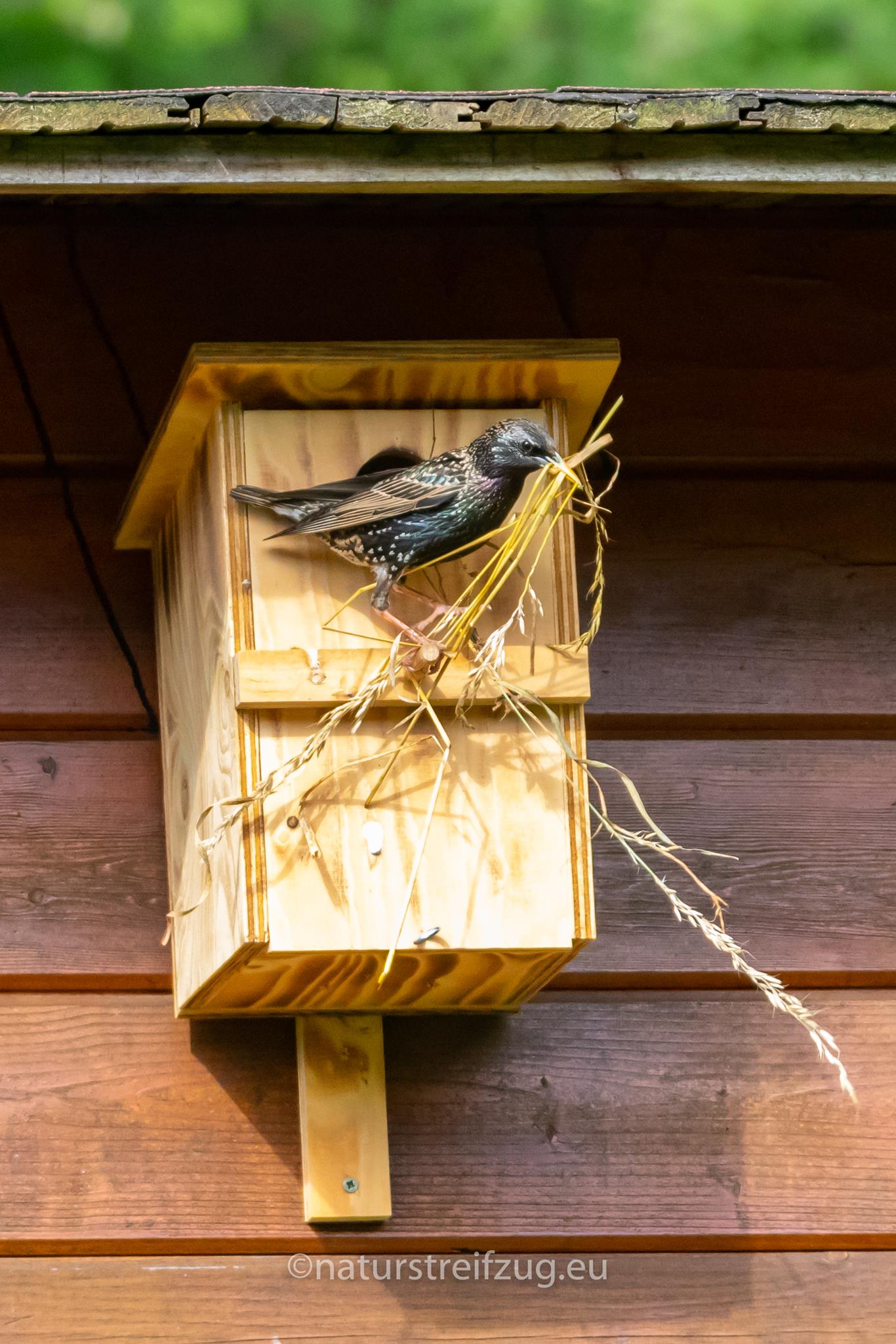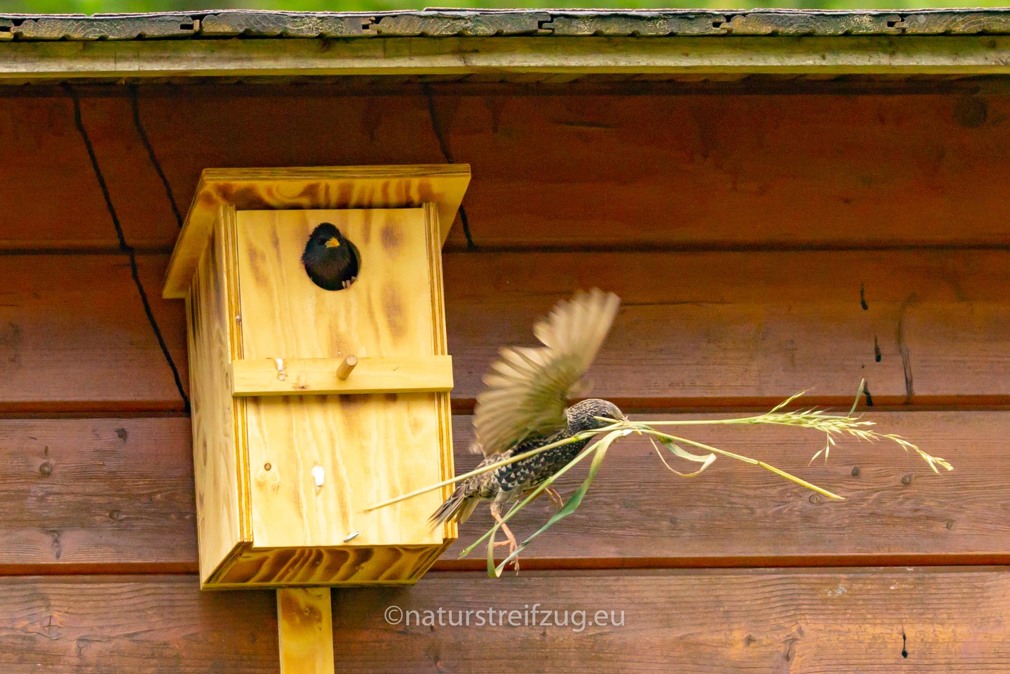 Eifrig wurde Nistmaterial herangeschafft vorzugsweise vom Starenmännchen, während die Hausherrin sich im Inneren zu schaffen machte. Aber oft hatte man den Schnabel mit langen Halmen so voll, dass man nicht wusste, wie auf der Sitzstange landen und das Baumaterial durchs Loch zu bringen. Dann flog man wieder weg und versuchte in mehrmaligen Anflugversuchen, das Loch passgenau zu treffen und das Baumaterial ins Innere zu bugsieren.