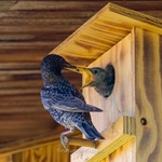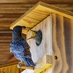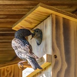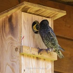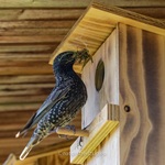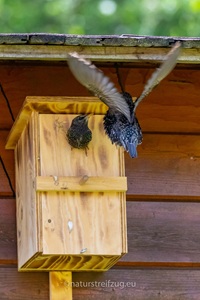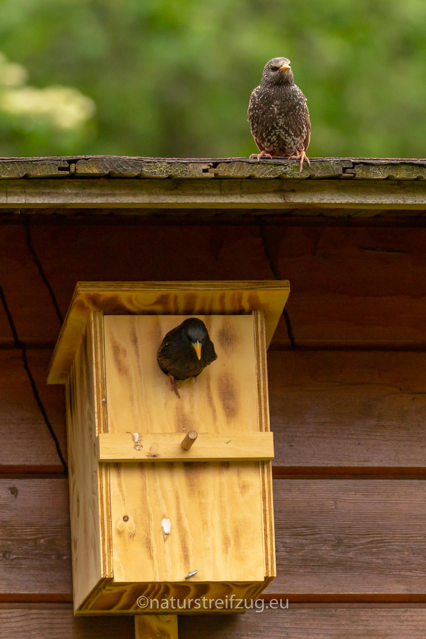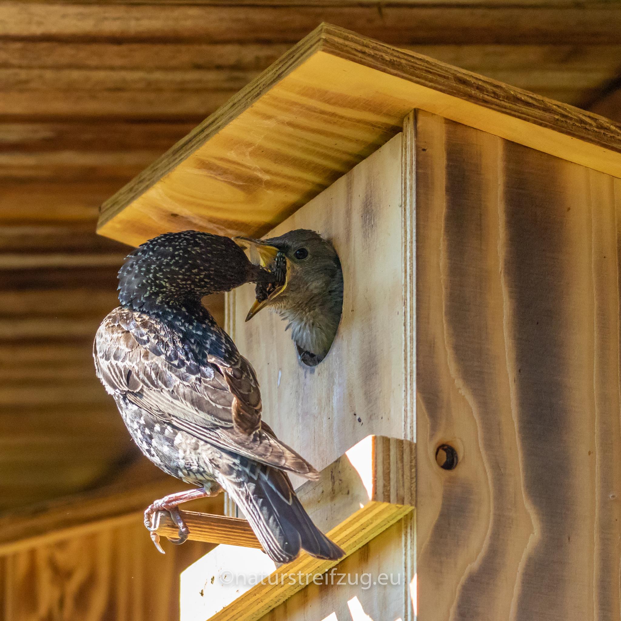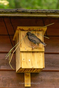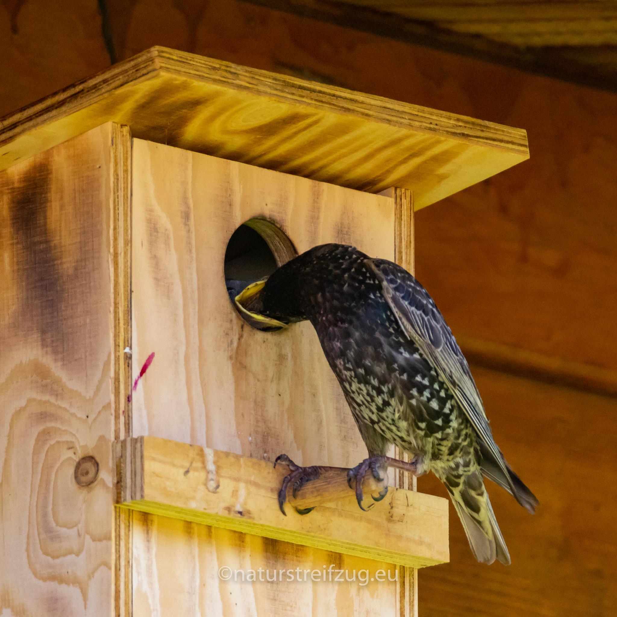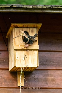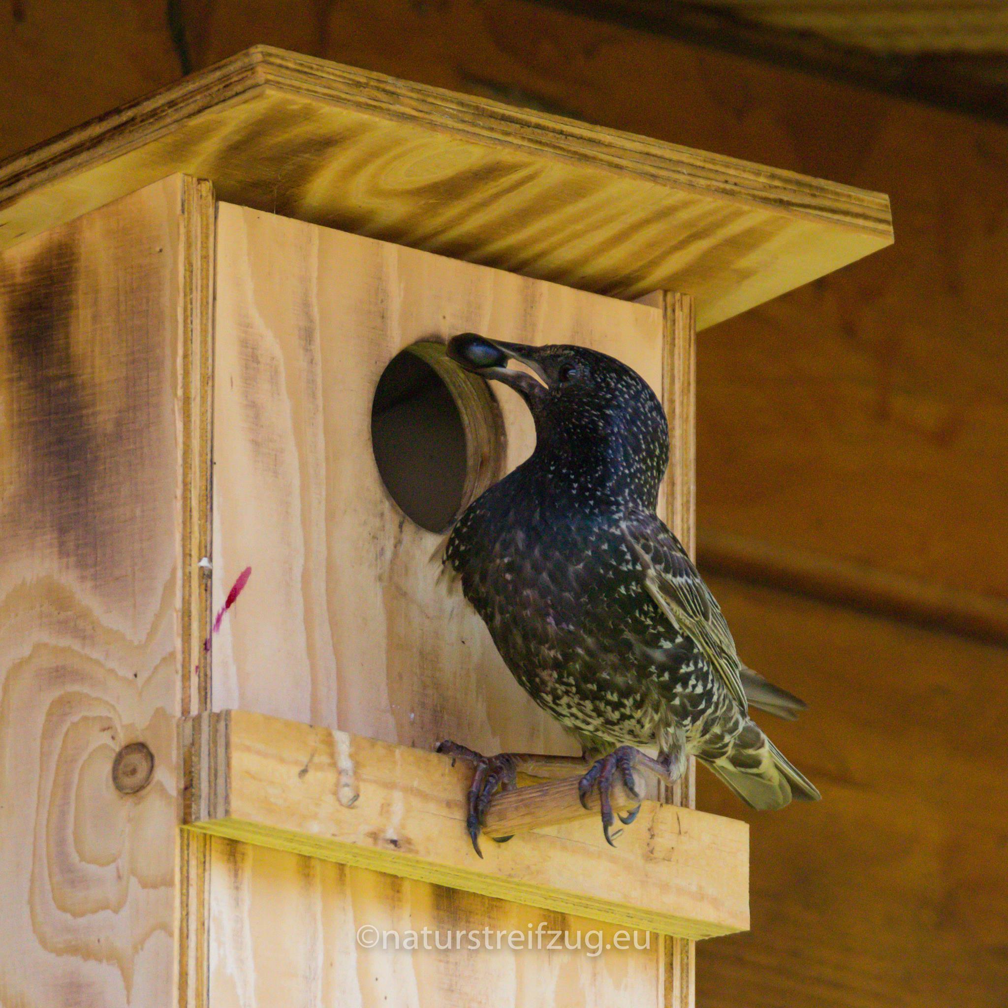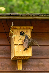Eifrig wurde Nistmaterial herangeschafft vorzugsweise vom Starenmännchen, während die Hausherrin sich im Inneren zu schaffen machte. Aber oft hatte man den Schnabel mit langen Halmen so voll, dass man nicht wusste, wie auf der Sitzstange landen und das Baumaterial durchs Loch zu bringen. Dann flog man wieder weg und versuchte in mehrmaligen Anflugversuchen, das Loch passgenau zu treffen und das Baumaterial ins Innere zu bugsieren.