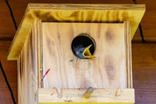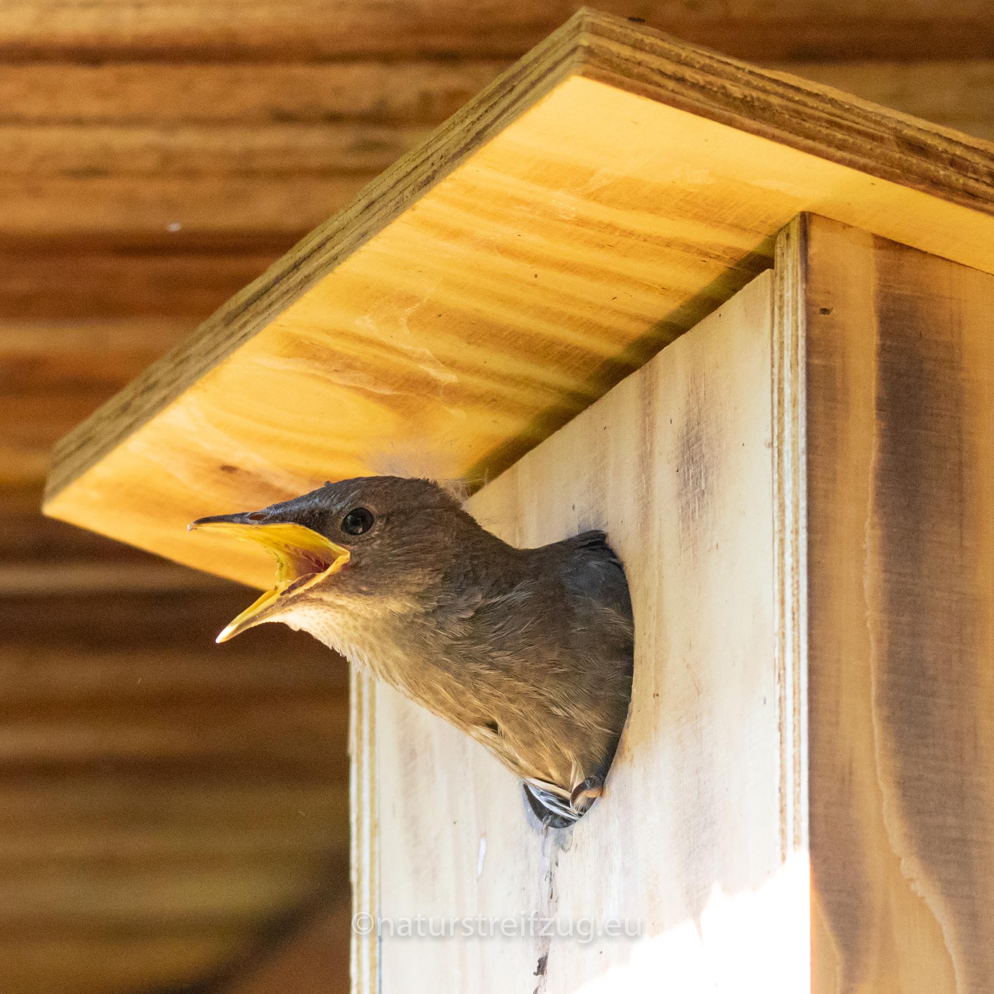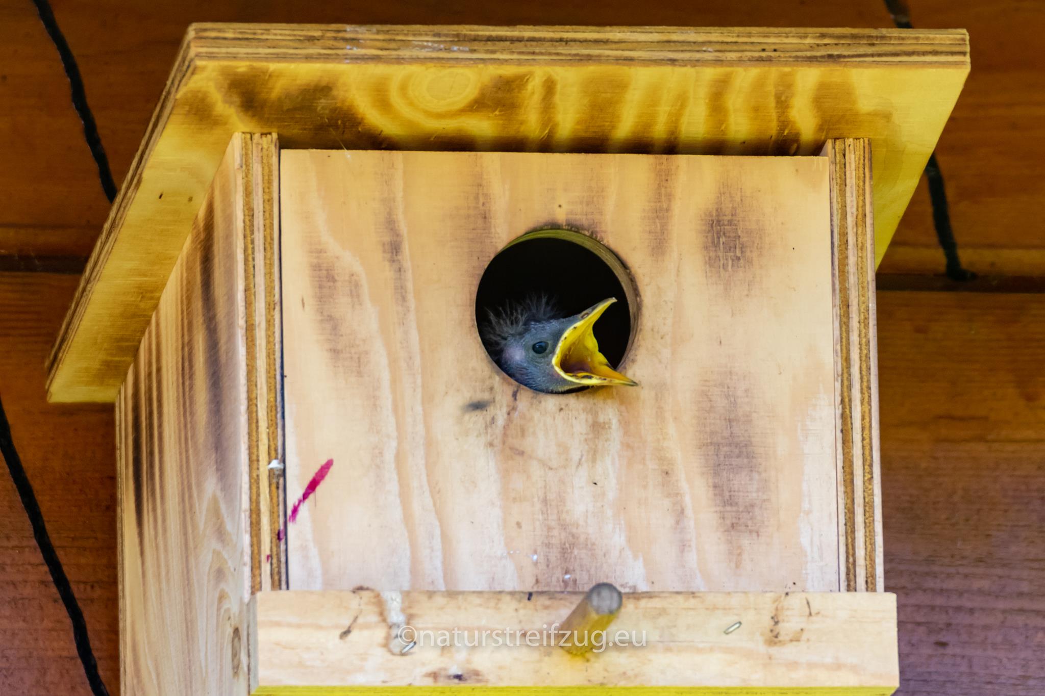 Als wir nach einwöchiger Abwesenheit zurück kamen, war aus dem Kasten bereits Kindergeschrei zu hören, sobald sich die Altvögel mit Beute näherten und damit noch ganz im Kasten verschwanden. Nach noch einmal anderthalb Wochen war der erste Schnabel im Loch zu entdecken.