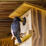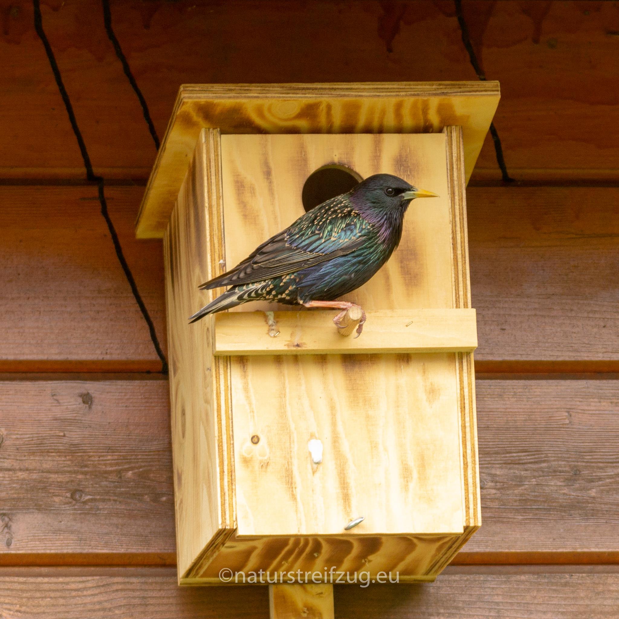 Wir waren uns nicht sicher, ob der Starenkasten an unserem Gartenhaus angenommen werden würde, da die Empfehlung lautet, ihn in ca. 4 Metern Höhe anzubringen. Außerdem hingen wir ihn auch erst sehr spät im Frühjahr 2018 auf. Lange Zeit tat sich auch nichts. Einmal beguckte sich ein Star vom Gartenhausdach die Reihe unterschiedlicher Nistkästen von oben, aber das wars dann fürs erste. Aber nach einigen Wochen beobachteten wir, dass der Kasten doch noch von einem Starenmännchen entdeckt worden war. Es saß auf dem Dach oder in der Korkenzieherweide, flötete und rief: "Ich habe eine Wohnung gefunden!"