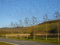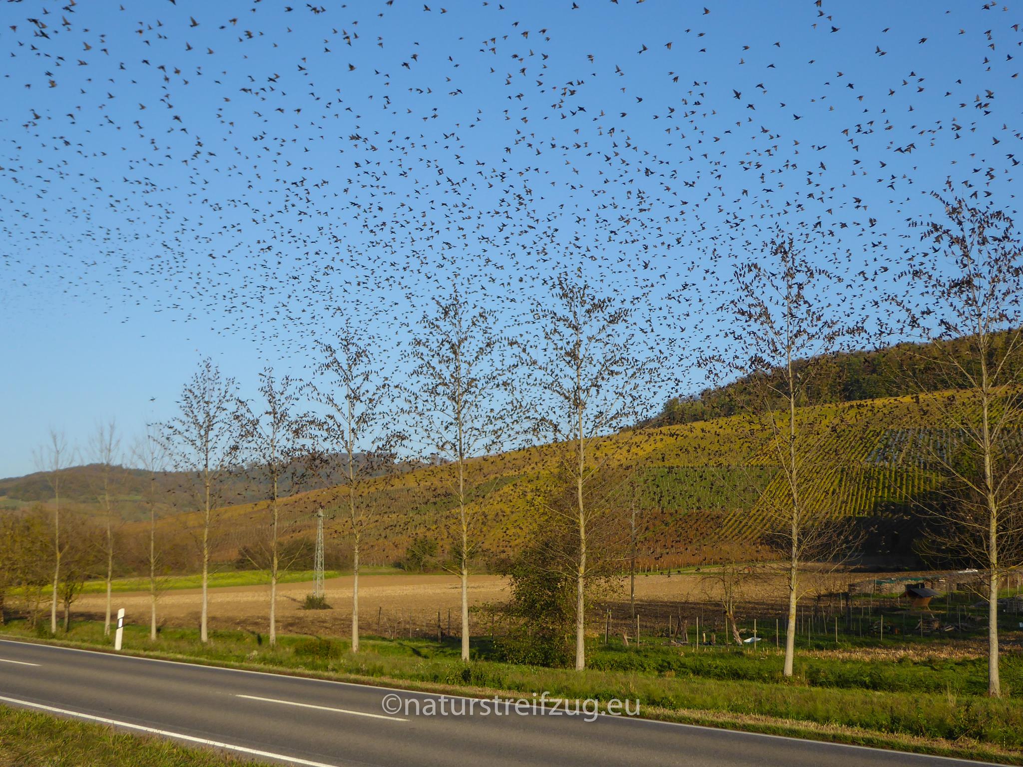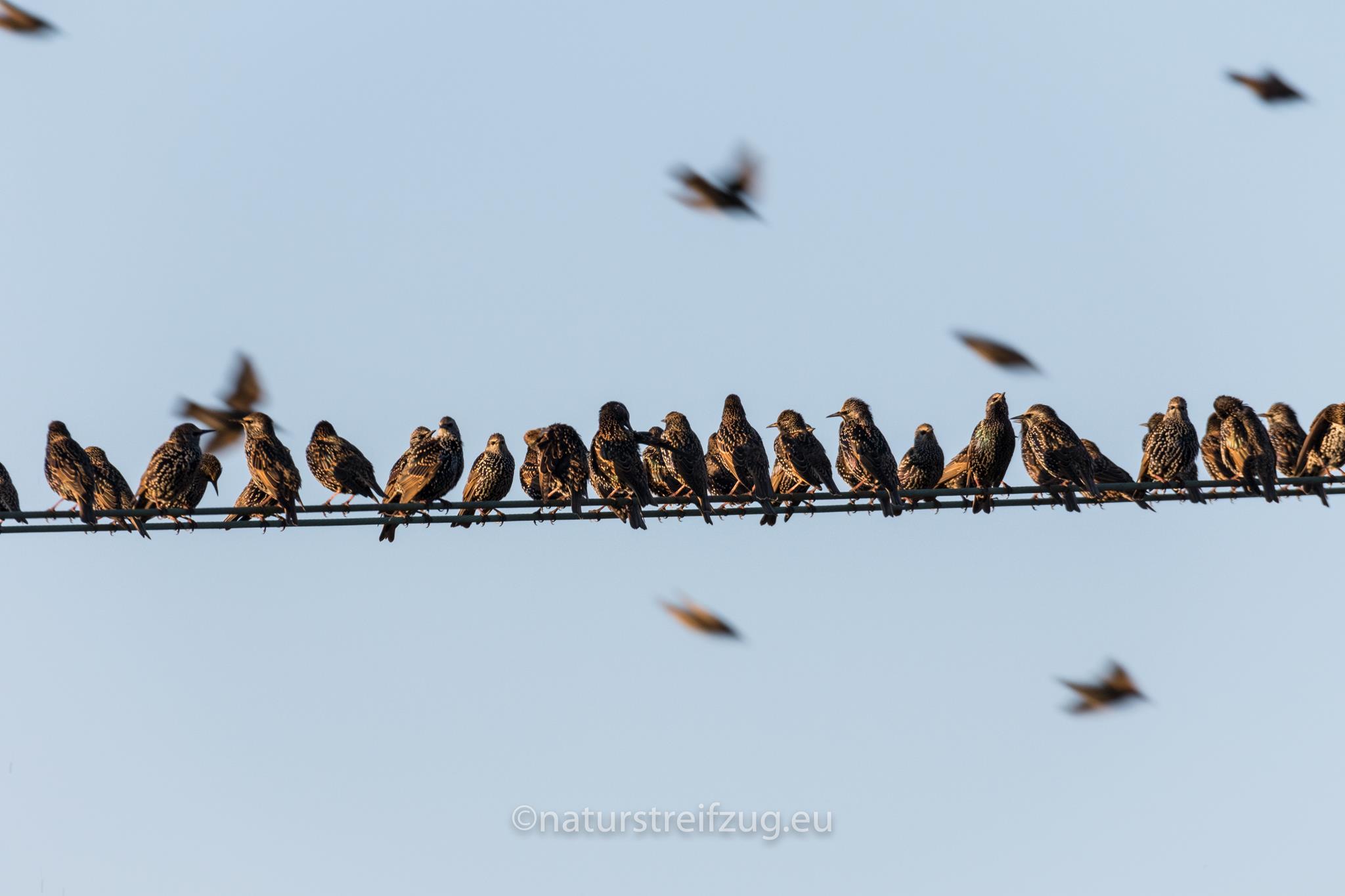 Bei einem Spaziergang Anfang November 2017 gerieten wir mitten in das folgende Schauspiel: unzählige Stare sammelten sich auf Bäumen sowie Leitungen für den Abflug in den Süden und vollführten am Himmel spektakuläre Formationen. Am folgenden Tag waren sie schon weitergezogen und obwohl wir mit dem Auto in der Umgebung herumfuhren, konnten wir es nicht ein zweites Mal beobachten geschweige denn photographieren. So bleiben uns nur diese zufälligen Aufnahmen - bis zum nächsten Mal. Wir werden aufmerksamer und hoffentlich rechtzeitiger zur Stelle sein!