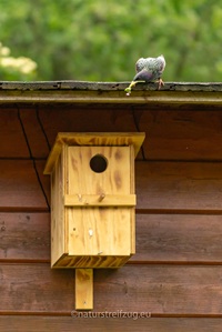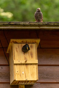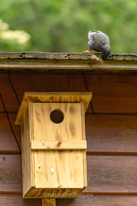Wer eine Wohnung anzubieten hat, kann bei der Damenwelt punkten. Bald war er nicht mehr alleine und vom Frühstückstisch mit Blick aufs Gartenhaus bot sich für uns nun tagtäglich das schönste Kino. Die Konkurrenz ist auch auf dem Vogelwohnungsmarkt groß. Jeder, der sich für diese Unterkunft auch noch zu interessieren schien, wurde fortan mit lautem Gezeter vertrieben, denn bald fand sich ein zweites Paar auf dem Dach ein, das die Wohnung inspizieren wollte und zu sagen schien: "Wie, für uns ist nichts da?"